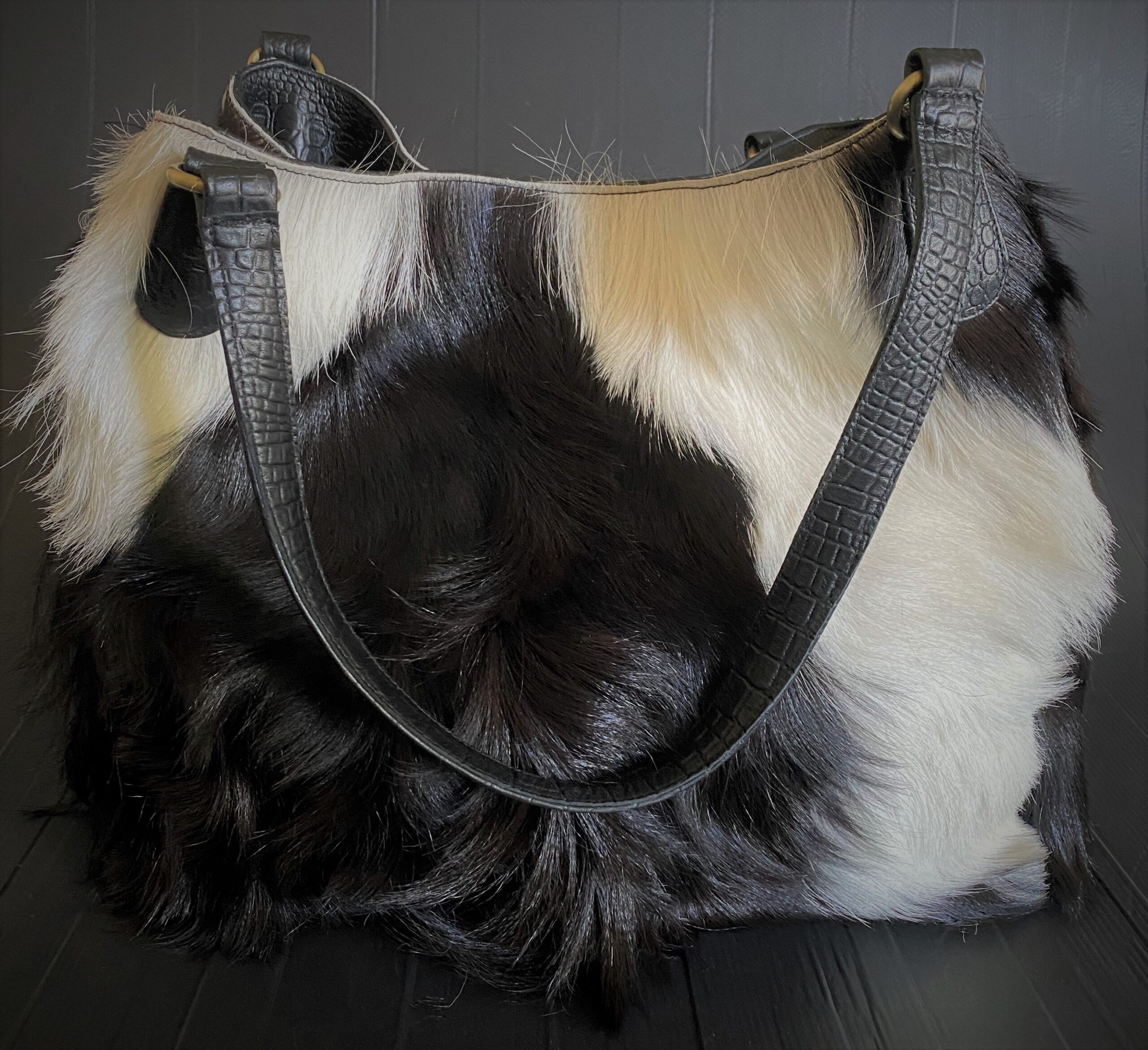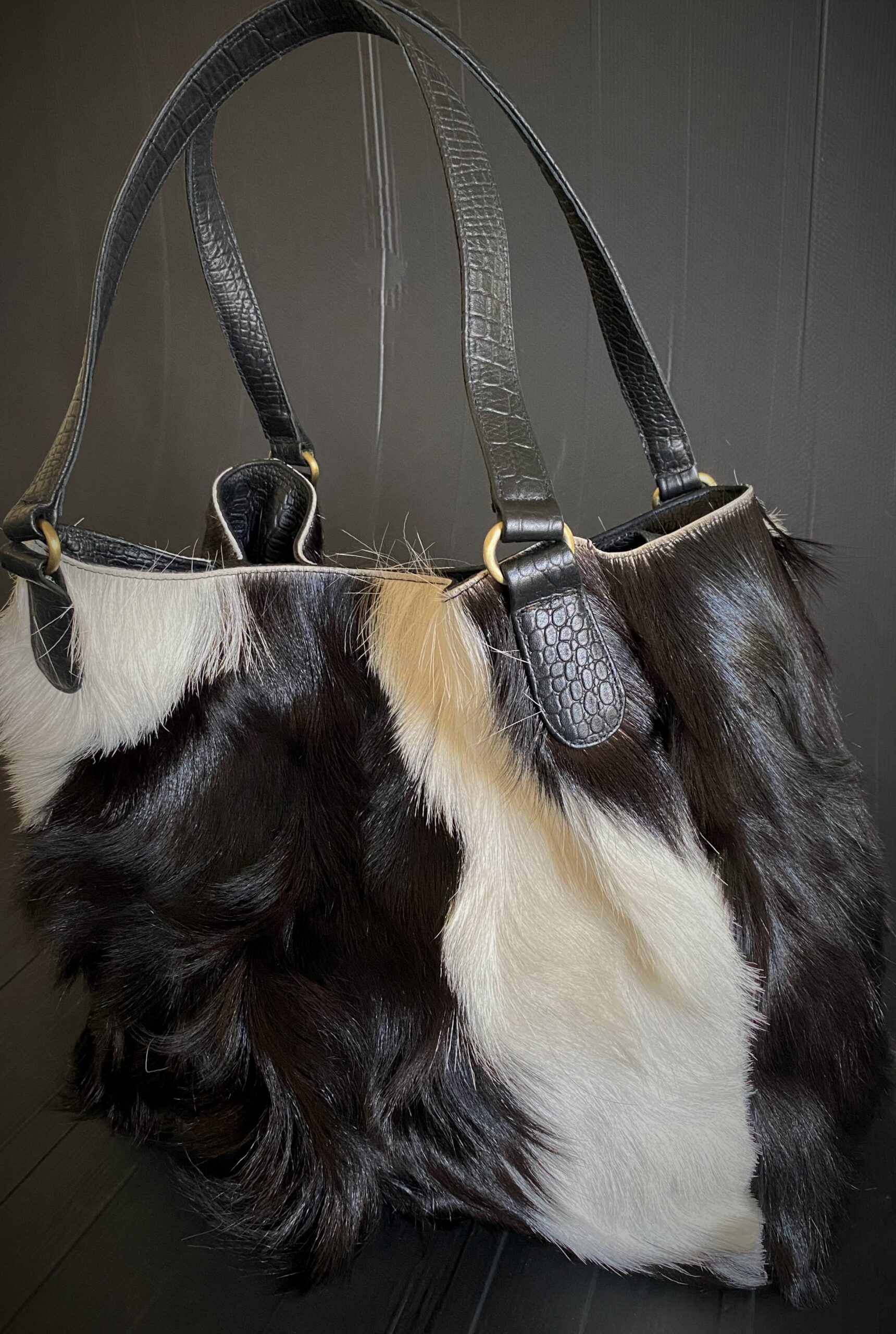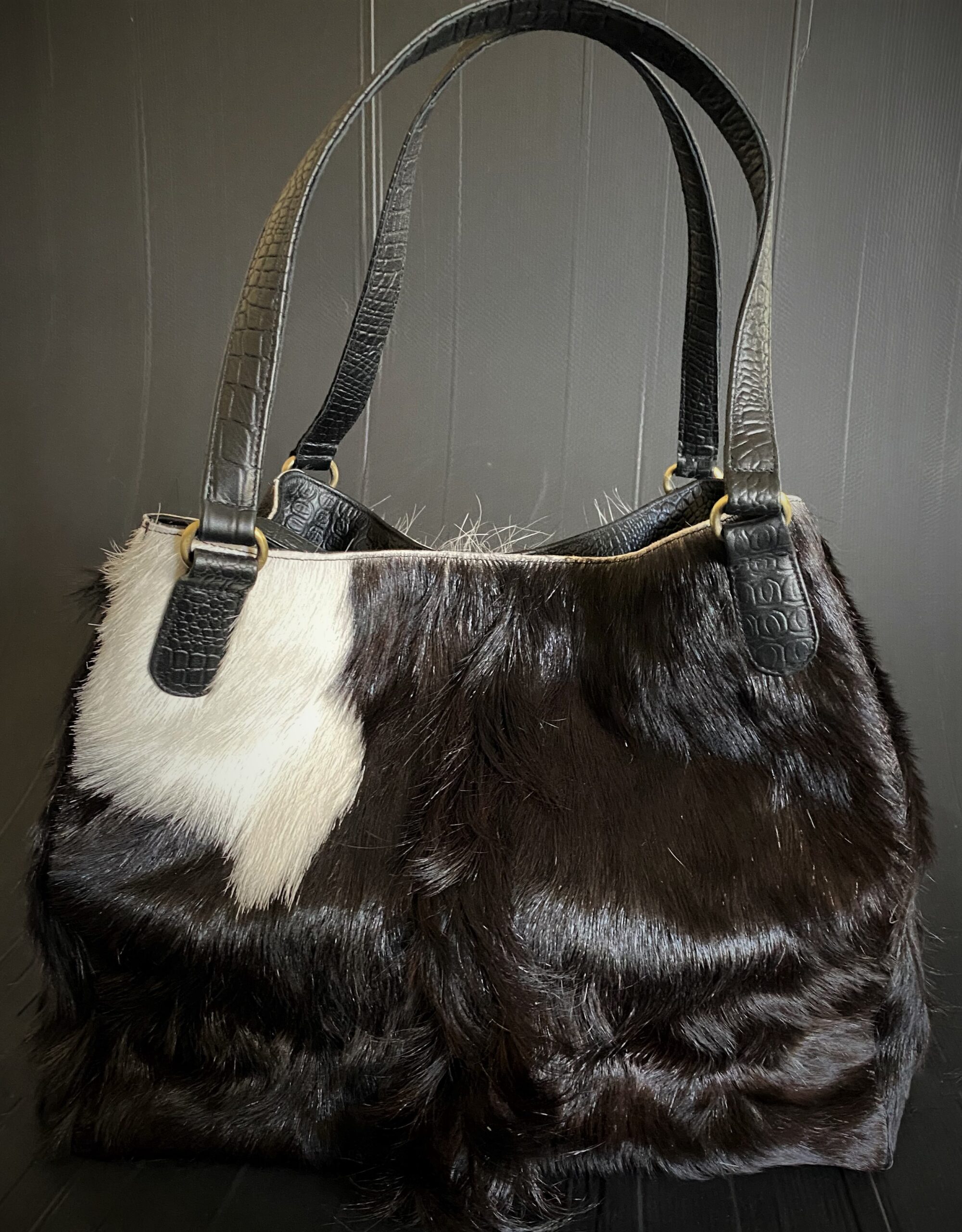 This stunning Tote is a real head turner, she is handcrafted from two hides showcasing the raw beauty and unique detail of the of the full hide motif front and back with matching side panels, croc embossed base, inside collar and shoulder straps.  Offering ample space to carry everything you need. Featuring open top with magnetic closure and clip for extra security, internal zip pocket with 2 additional easy access pockets for mobile phone, keys and accessories. Each hide is handpicked and forever unique!  You will be “Over the Moon” with this one!