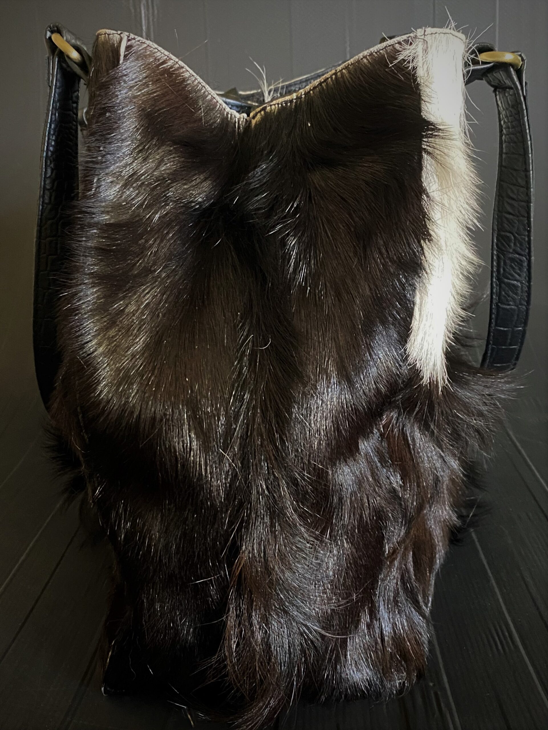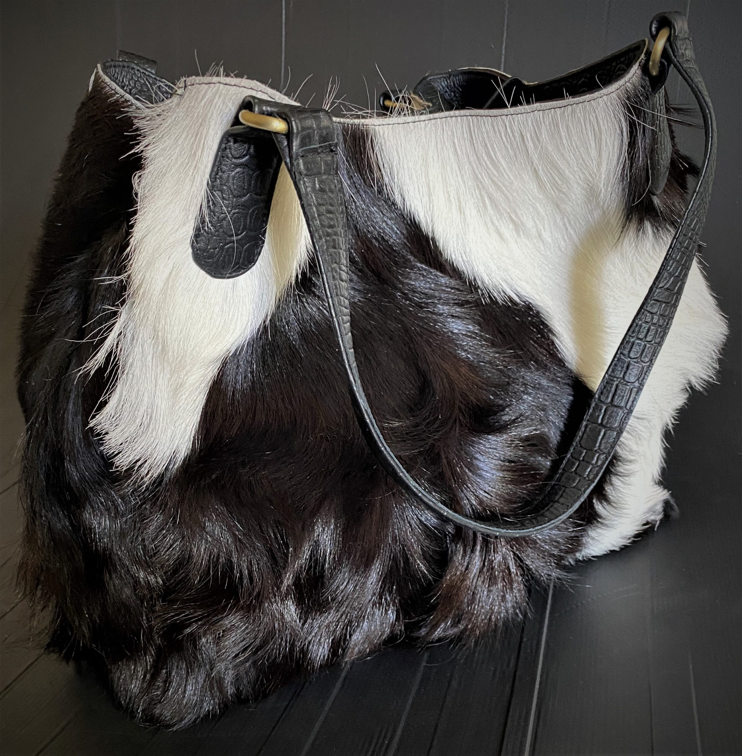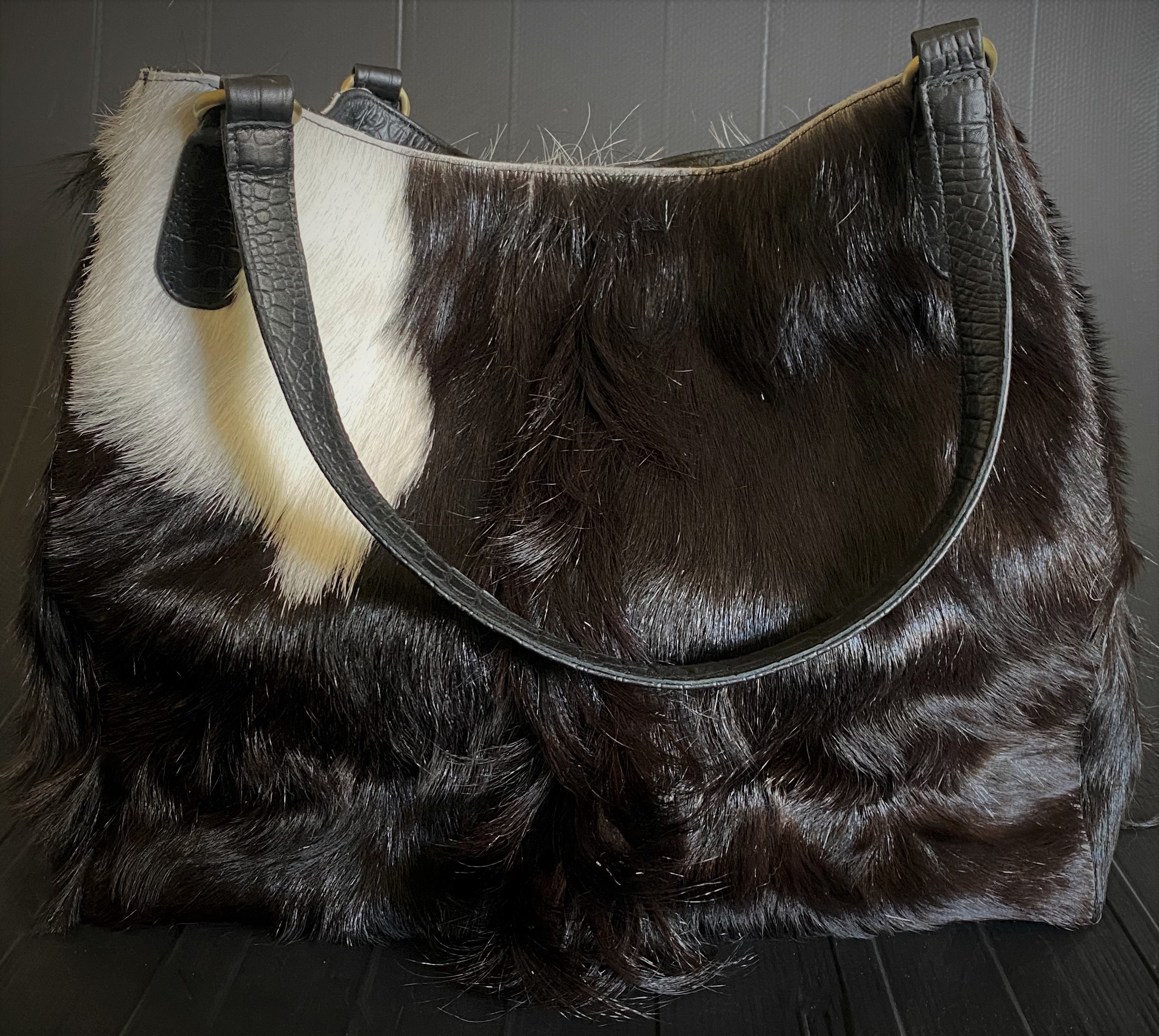 This stunning Tote is a real head turner, she is handcrafted from two hides showcasing the raw beauty and unique detail of the of the full hide motif front and back with matching side panels, croc embossed base, inside collar and shoulder straps.  Offering ample space to carry everything you need. Featuring open top with magnetic closure and clip for extra security, internal zip pocket with 2 additional easy access pockets for mobile phone, keys and accessories. Each hide is handpicked and forever unique!  You will be “Over the Moon” with this one!