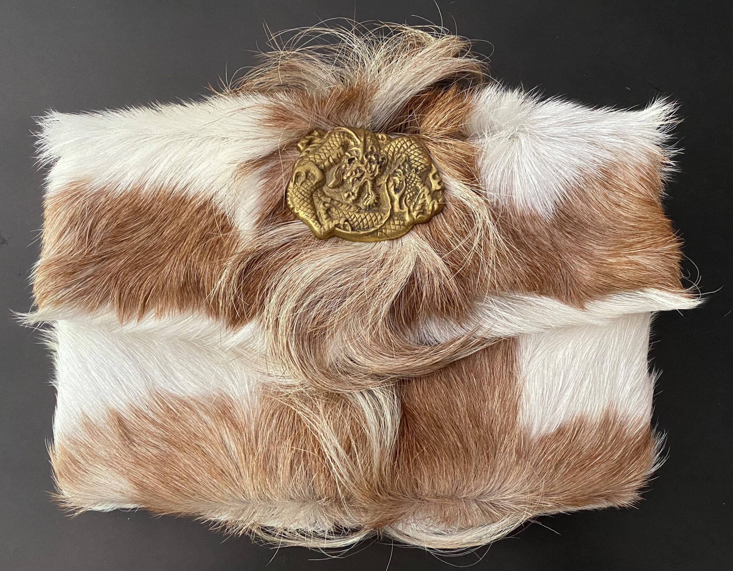 Eden will be the envy of all your friends. Handcrafted from goat hide, she folds over with 6 hidden magnets to hold her into place.  Featuring a dragon motif on the front, suede lining with 2 internal pockets.  Space for you to carry your essentials, lippy, phone, wallet.  This stunning piece is a must have to compliment any outfit, a night out won’t be complete without it.  Each hide is handpicked and forever unique!