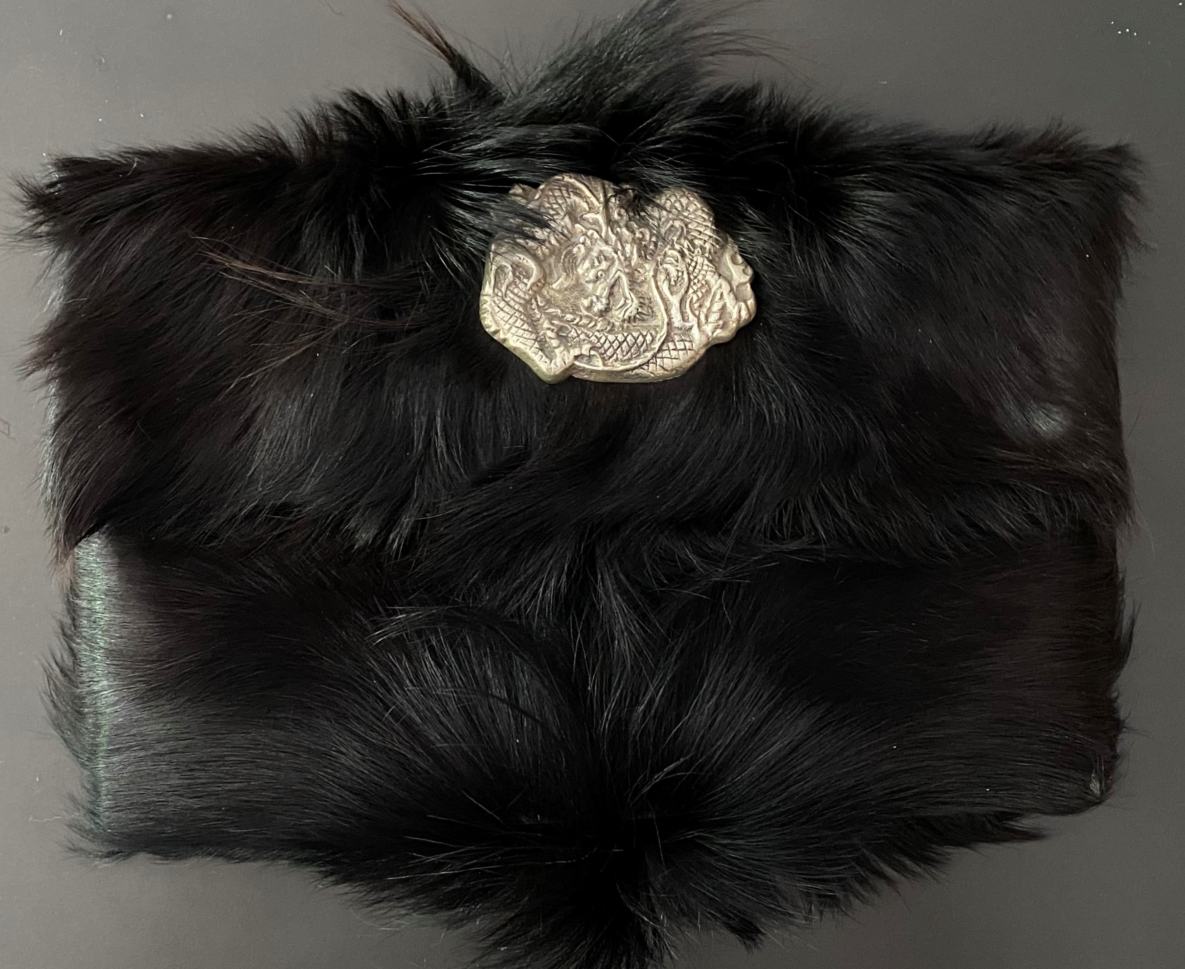 Eden will be the envy of all your friends. Handcrafted from goat hide, she folds over with 6 hidden magnets to hold her into place.  Featuring a dragon motif on the front, suede lining with 2 internal pockets.  Space for you to carry your essentials, lippy, phone, wallet.  This stunning piece is a must have to compliment any outfit, a night out won’t be complete without it.  Each hide is handpicked and forever unique!