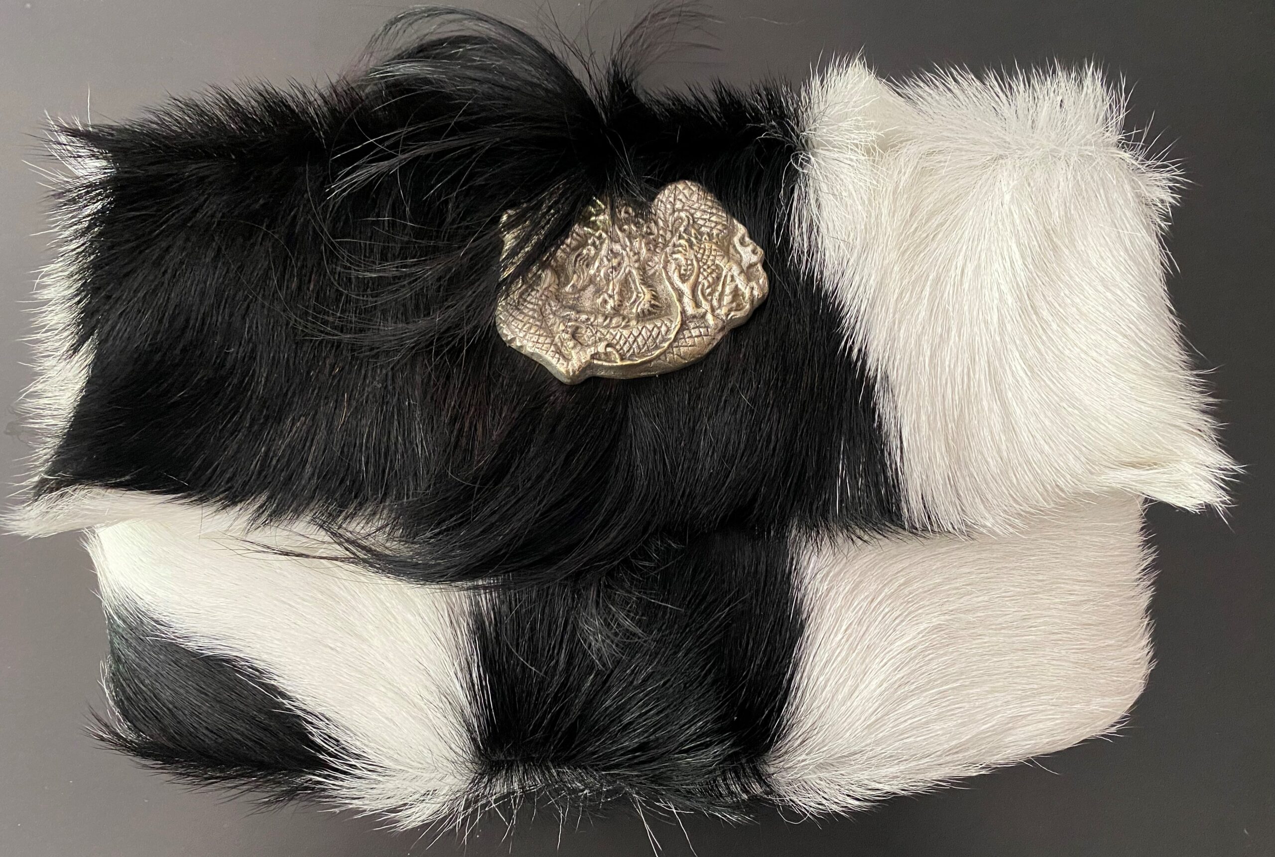 Eden will be the envy of all your friends. Handcrafted from goat hide, she folds over with 6 hidden magnets to hold her into place.  Featuring a dragon motif on the front, suede lining with 2 internal pockets.  Space for you to carry your essentials, lippy, phone, wallet.  This stunning piece is a must have to compliment any outfit, a night out won’t be complete without it.  Each hide is handpicked and forever unique!