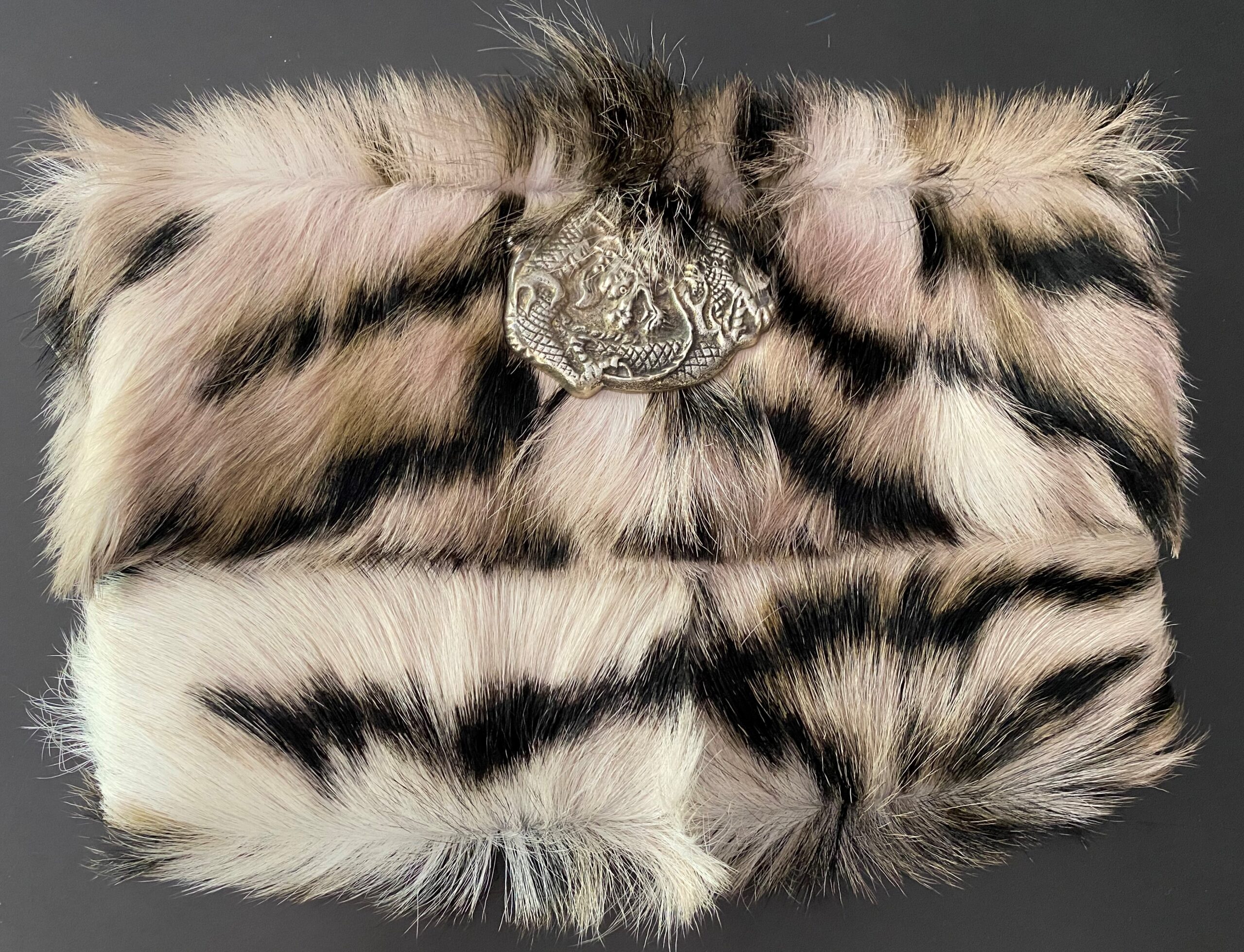 Eden will be the envy of all your friends. Handcrafted from goat hide and finished with animal print, she folds over with 6 hidden magnets to hold her into place.  Featuring a dragon motif on the front, suede lining with 2 internal pockets.  Space for you to carry your essentials, lippy, phone, wallet.  This stunning piece is a must have to compliment any outfit, a night out won’t be complete without it.  Each hide is handpicked and forever unique!
