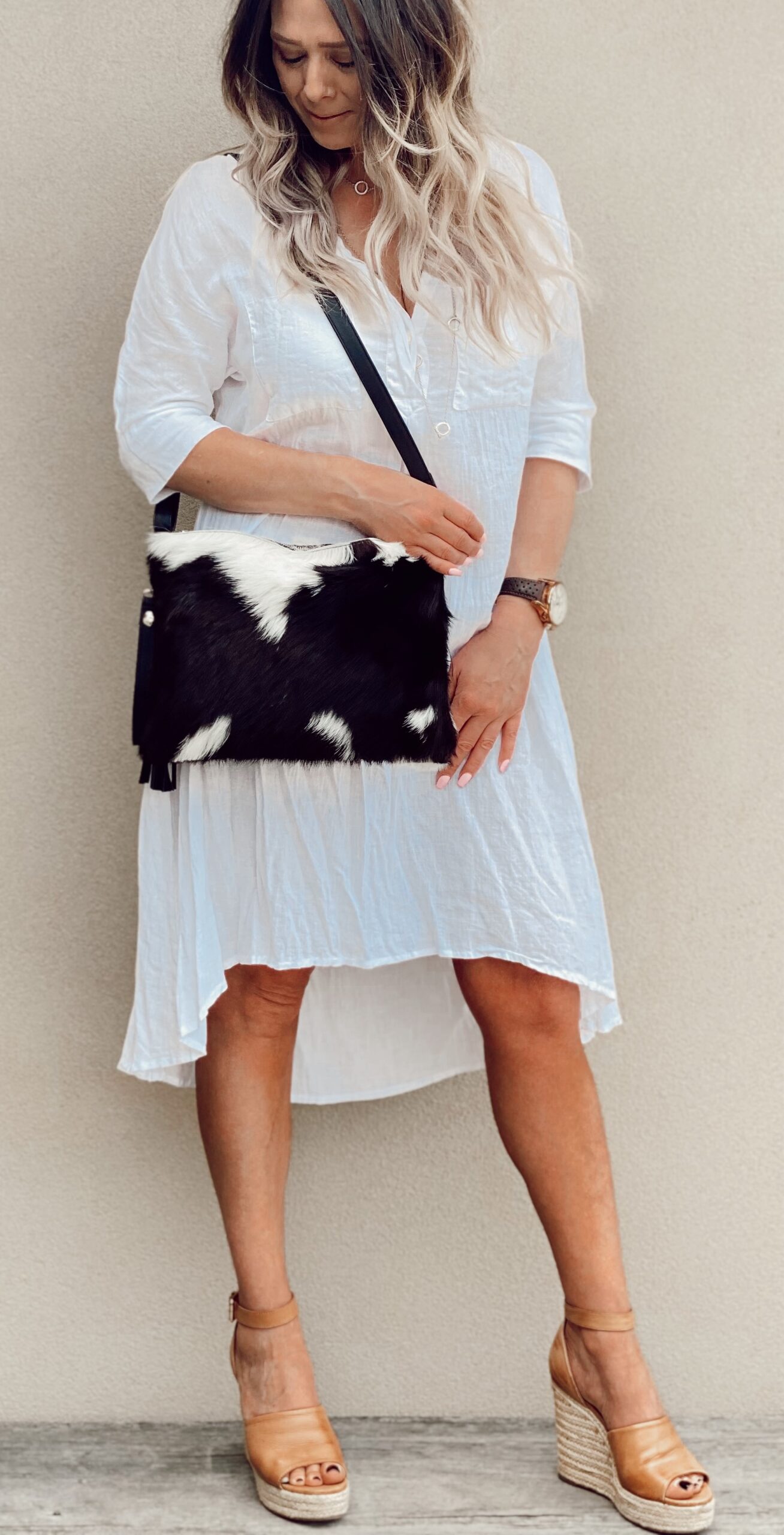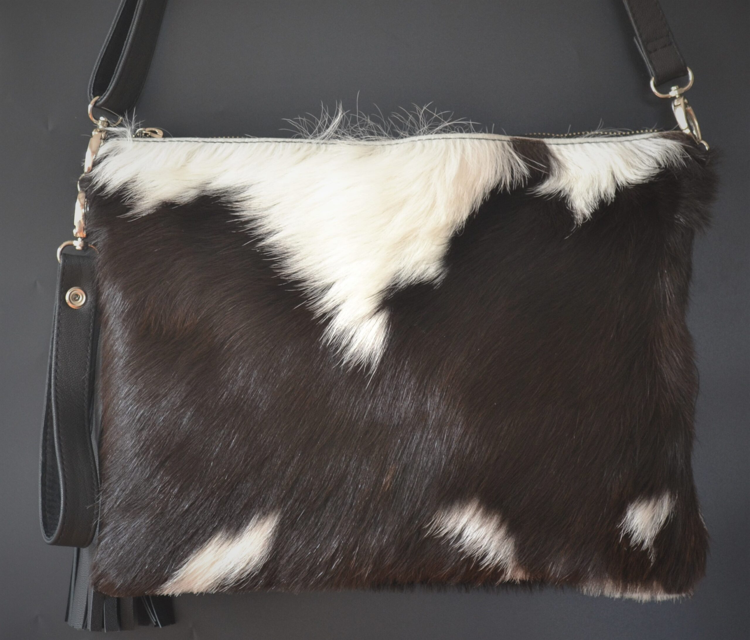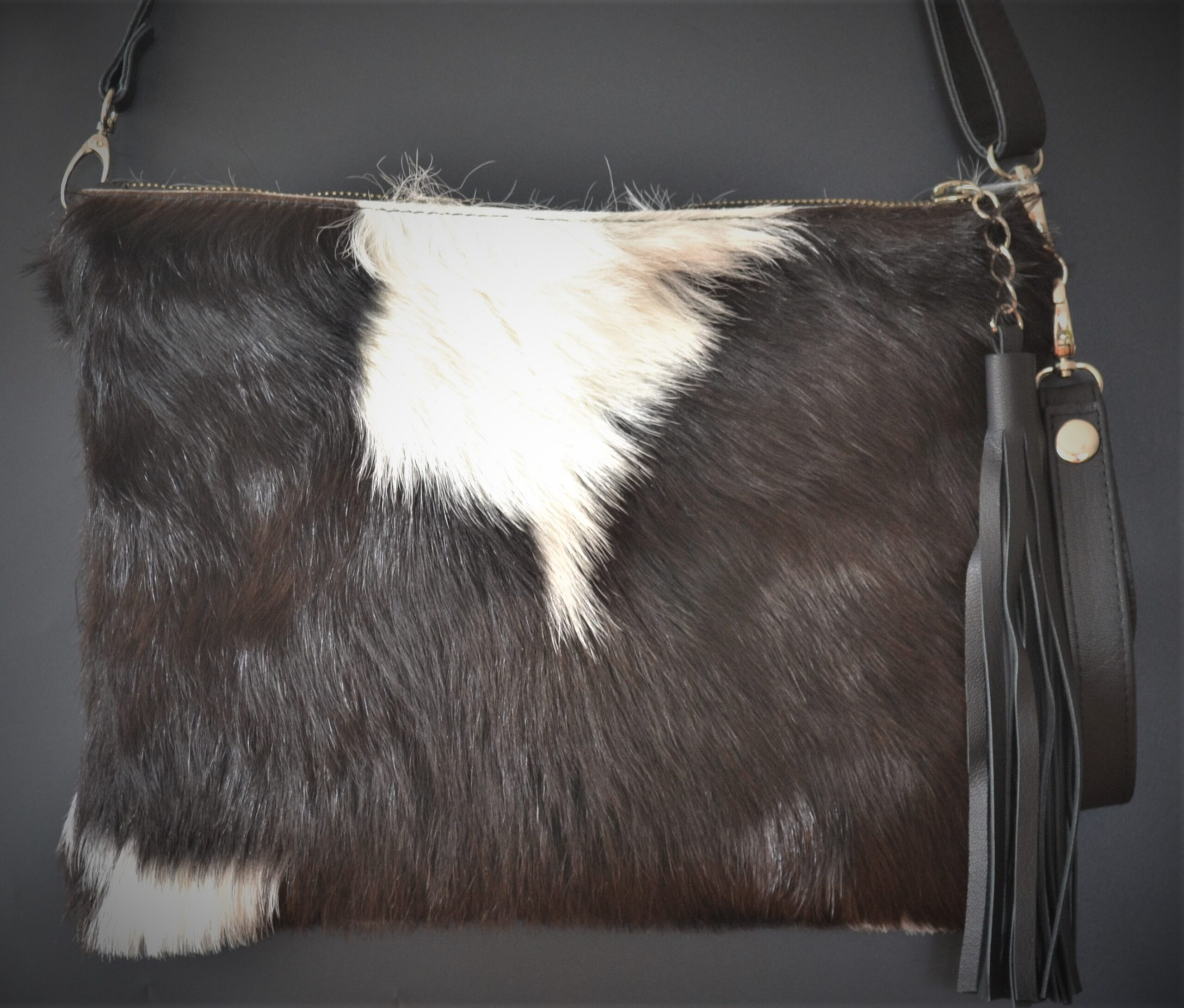 The Eumundi is simple yet sophisticated with hide on both sides of bag. Worn easily cross body with adjustable/detachable shoulder strap, perfect for everyday use for women on the go. Featuring long tassel, 2 internal easy access pockets for mobile phone, keys and accessories. Each hide is handpicked and one of a kind, forever unique!