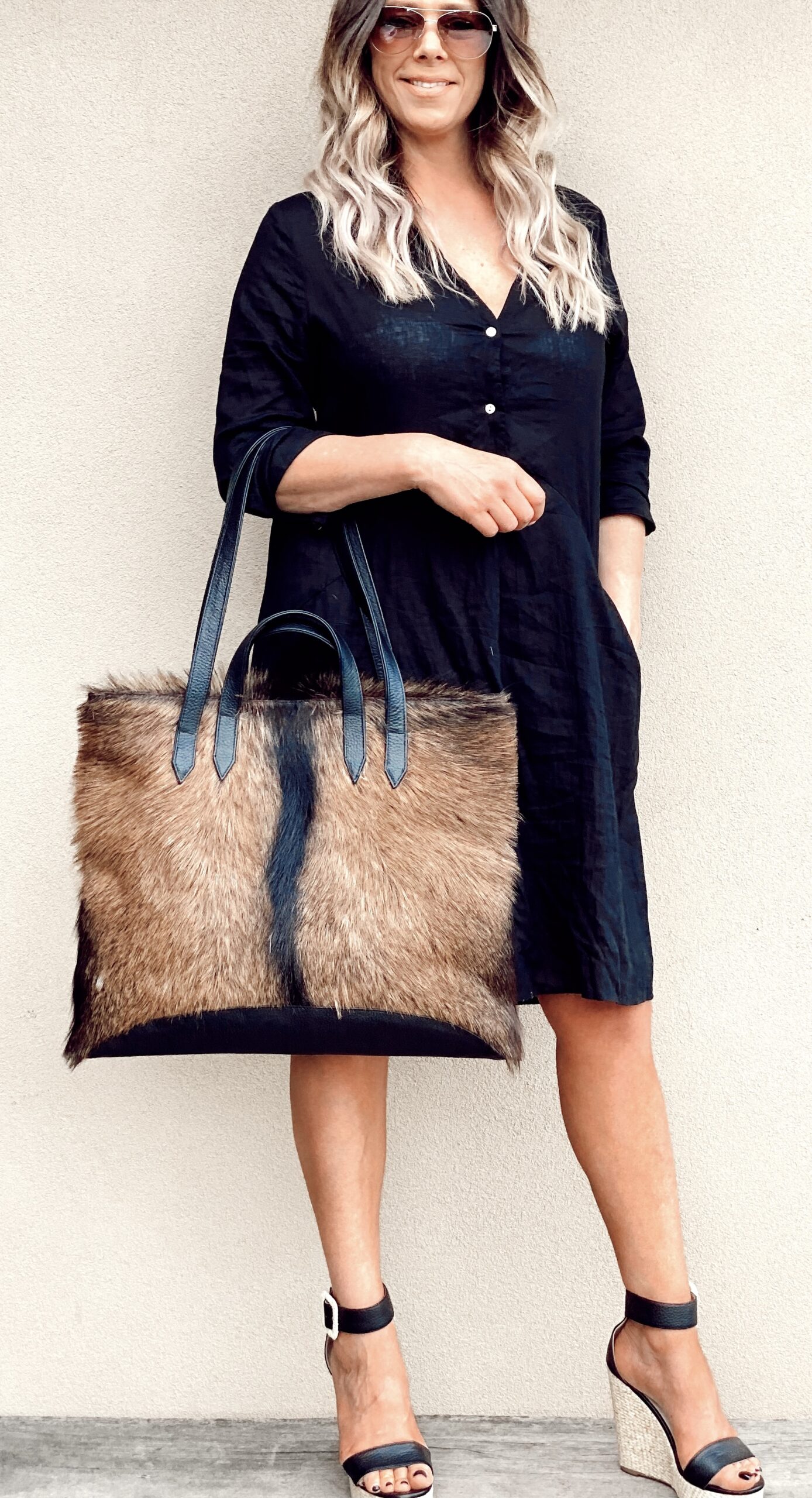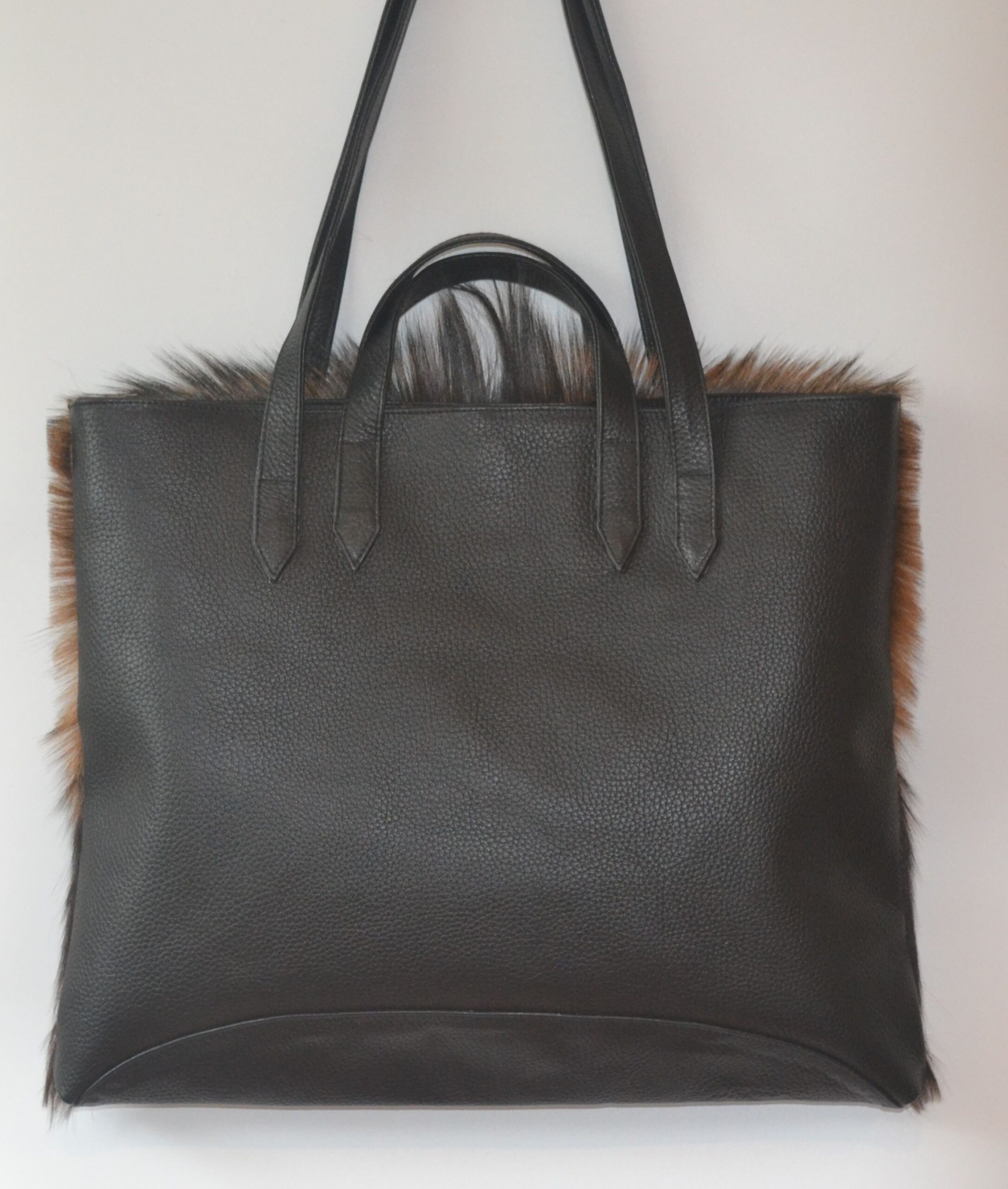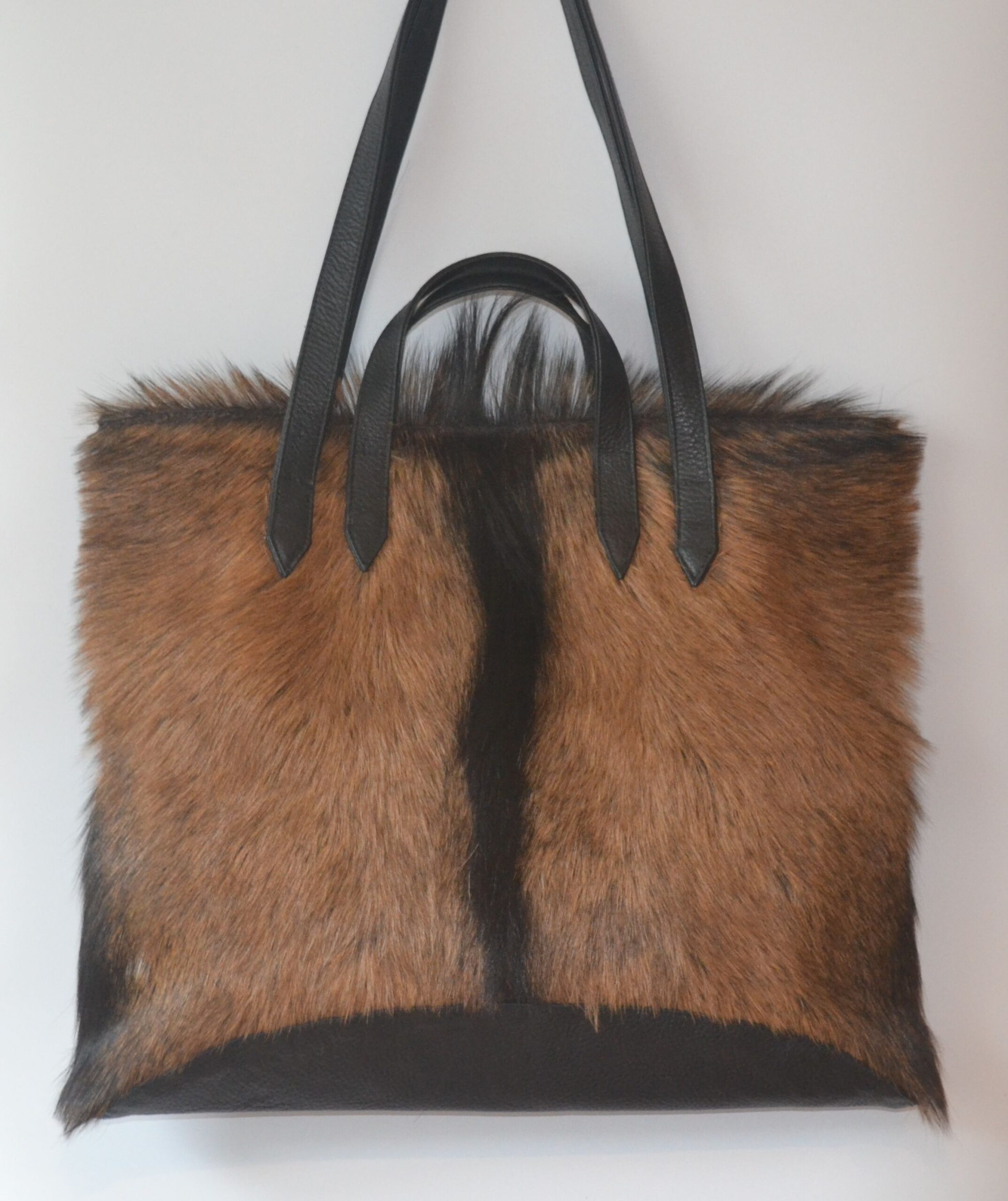 The big banger! King Billy Tote will serve you perfectly, from work files, to overnight bag, gym bag, baby bag, whilst making a statement with your one of a kind hide! With a goat hide front and a soft leather back. Featuring internal zip pocket with 2 additional easy access pockets for mobile phone, keys and accessories. You can carry by the handles or the shoulder straps. Each hide is handpicked and forever unique!