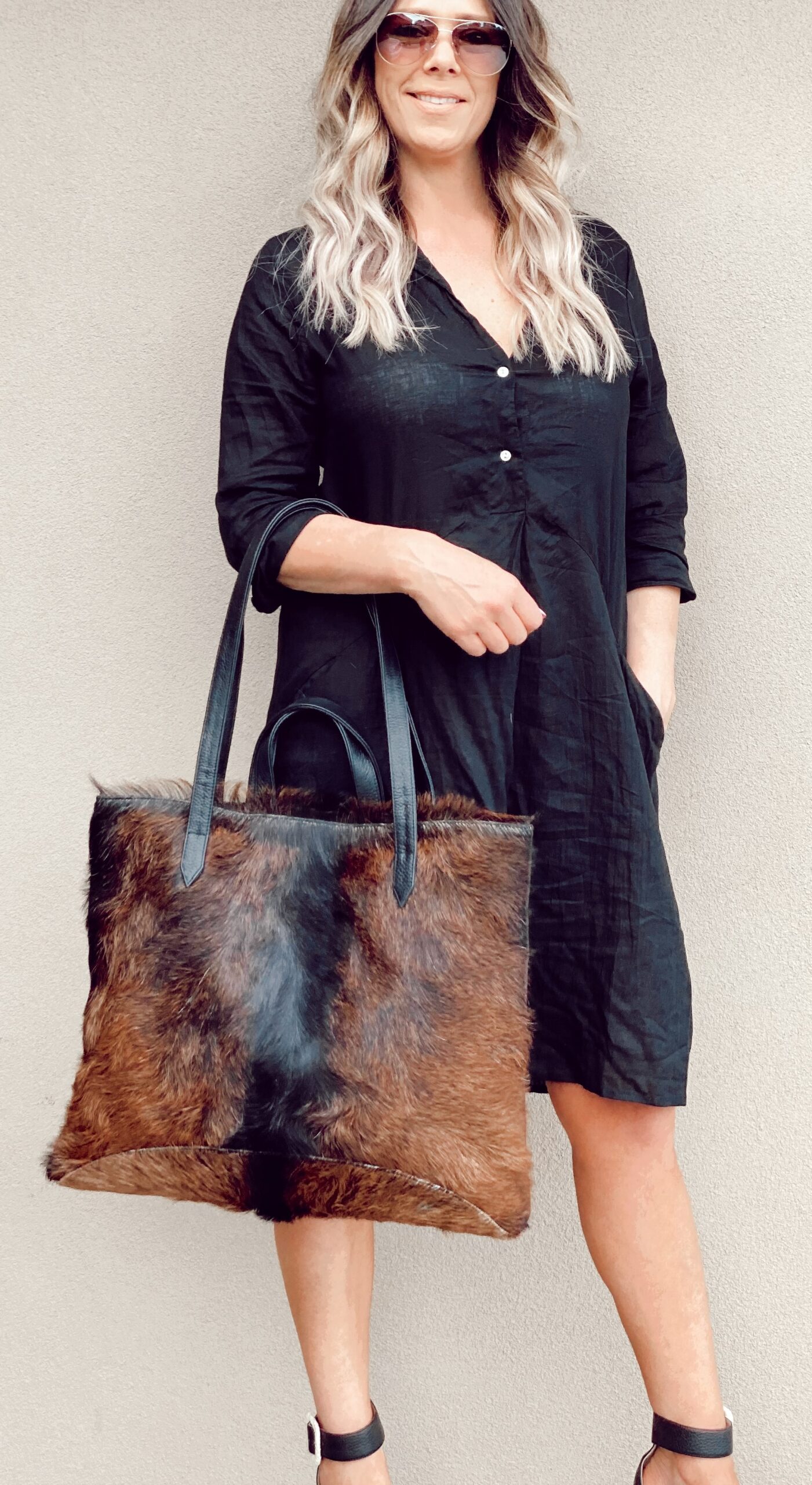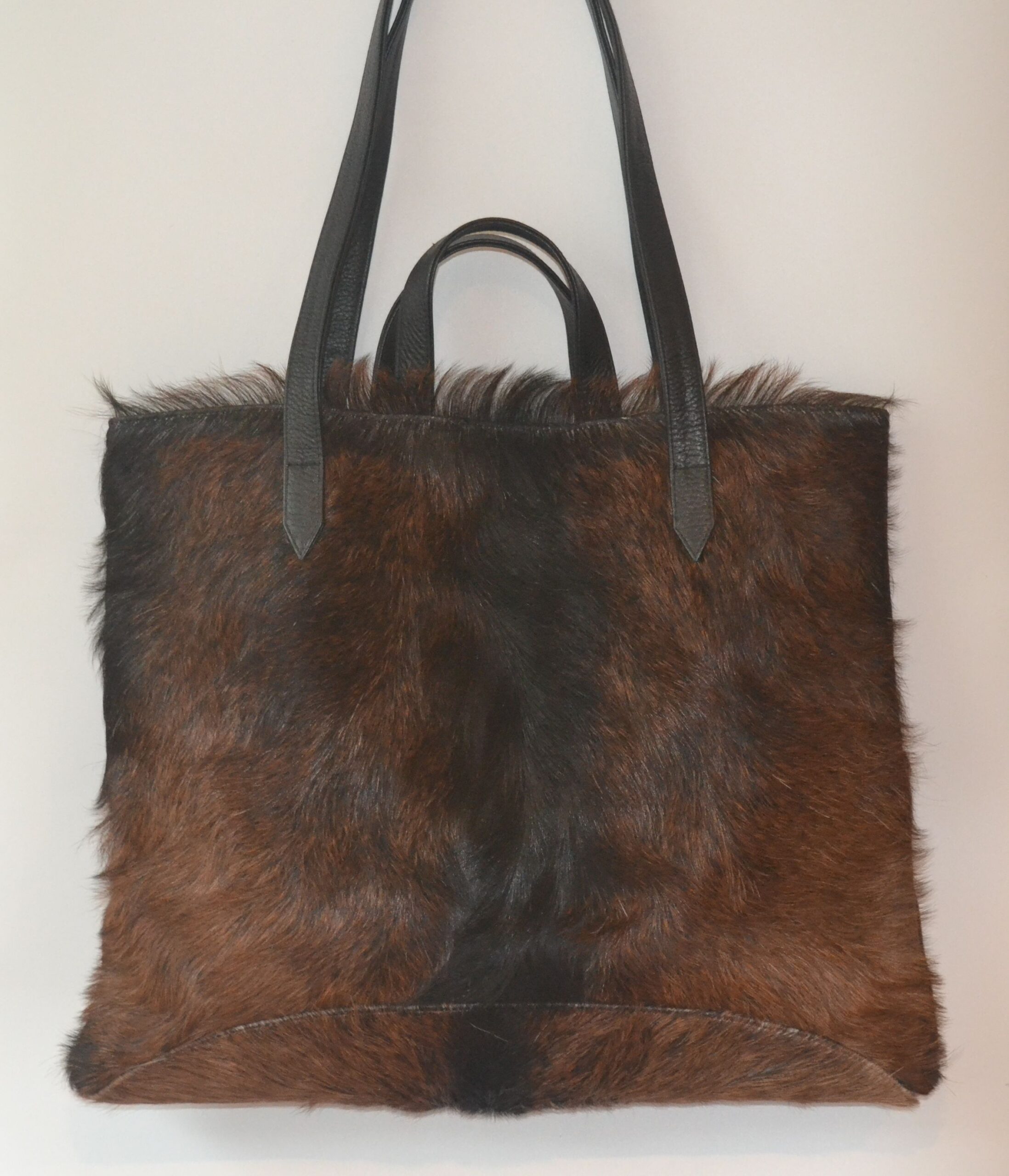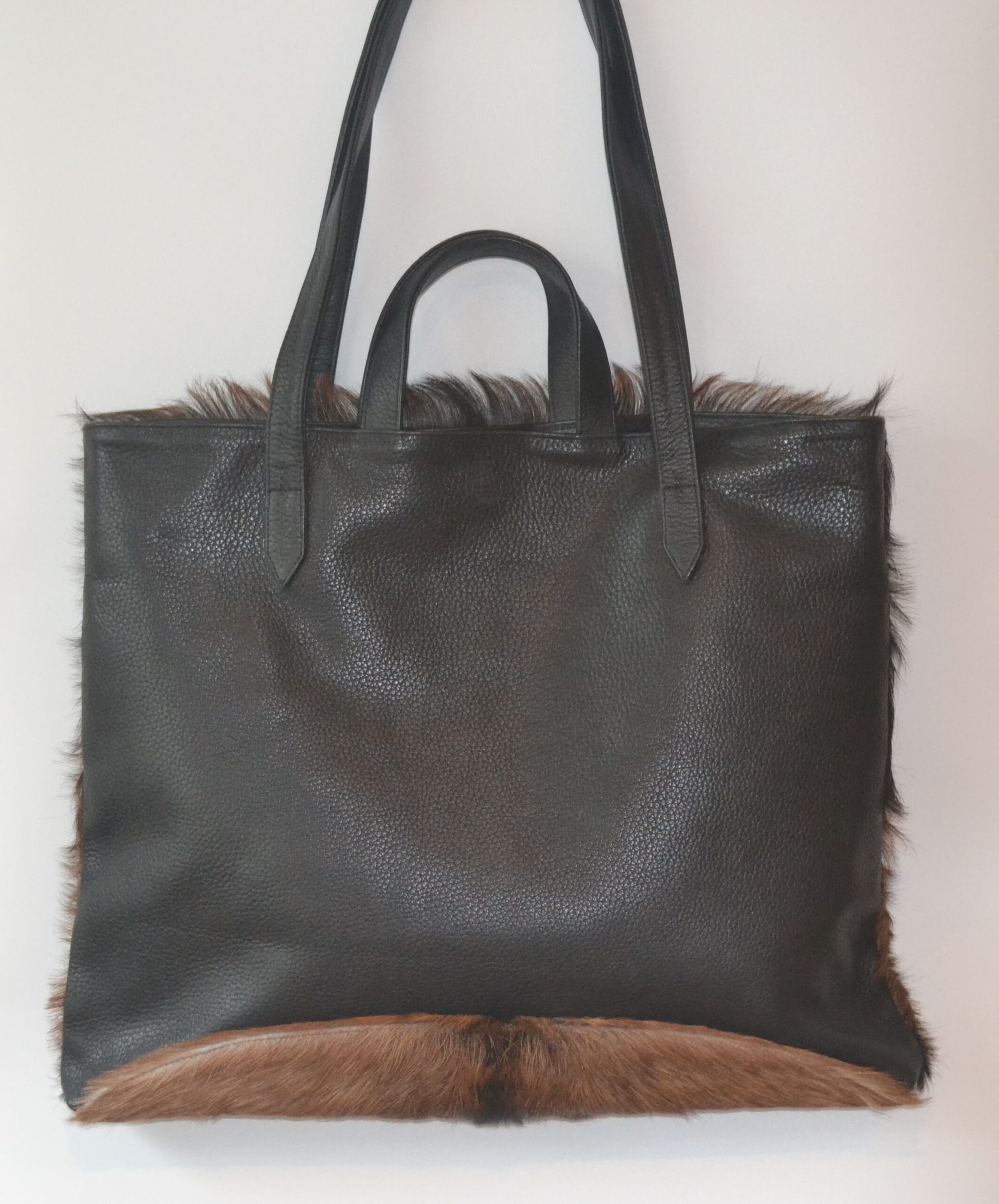 The big banger! King Billy Tote will serve you perfectly, from work files, to overnight bag, gym bag, baby bag, whilst making a statement with your one of a kind hide! With a goat hide front and a soft leather back. Featuring internal zip pocket with 2 additional easy access pockets for mobile phone, keys and accessories.  You can carry by the handles or the shoulder straps. Each hide is handpicked and forever unique!