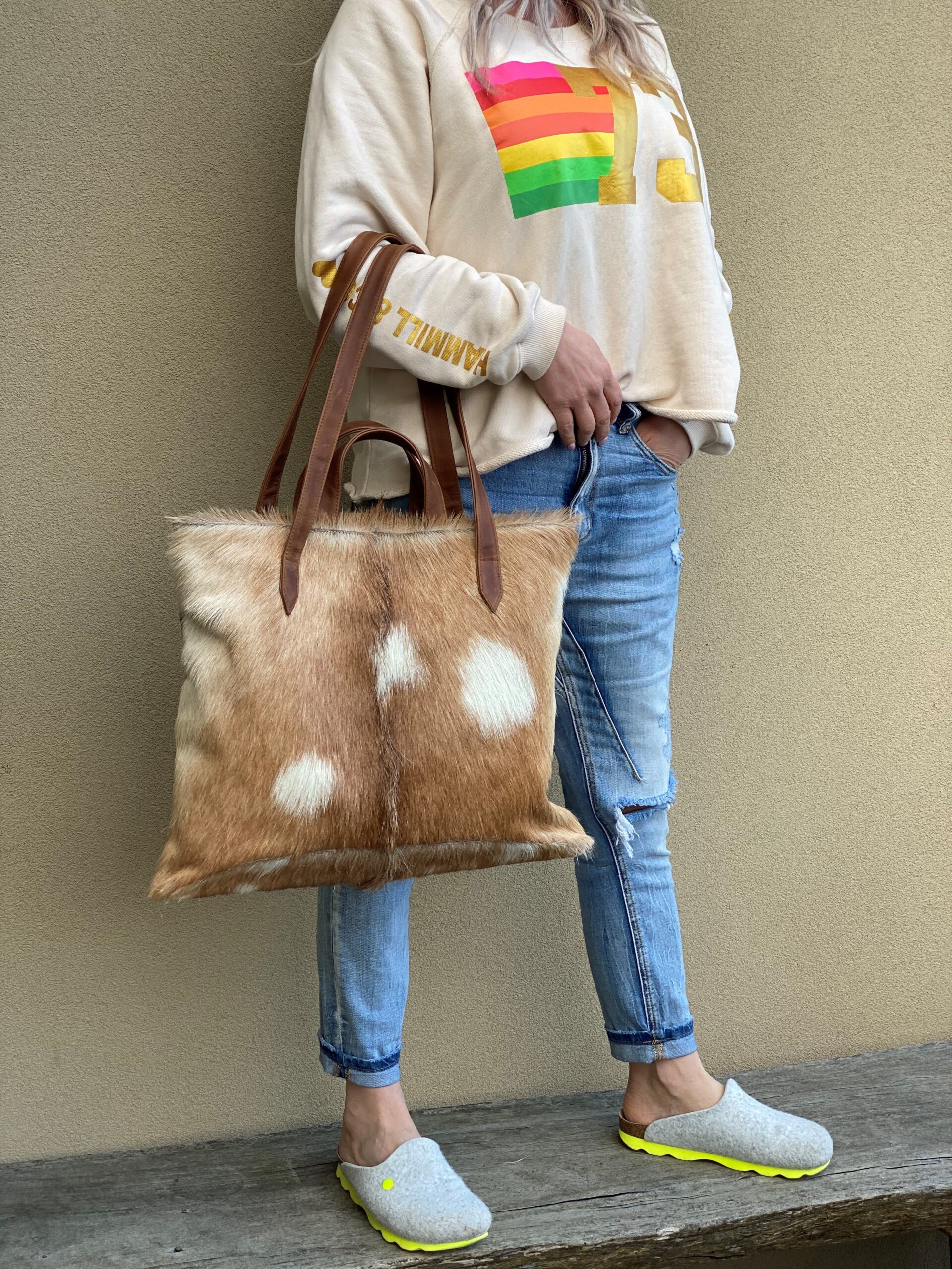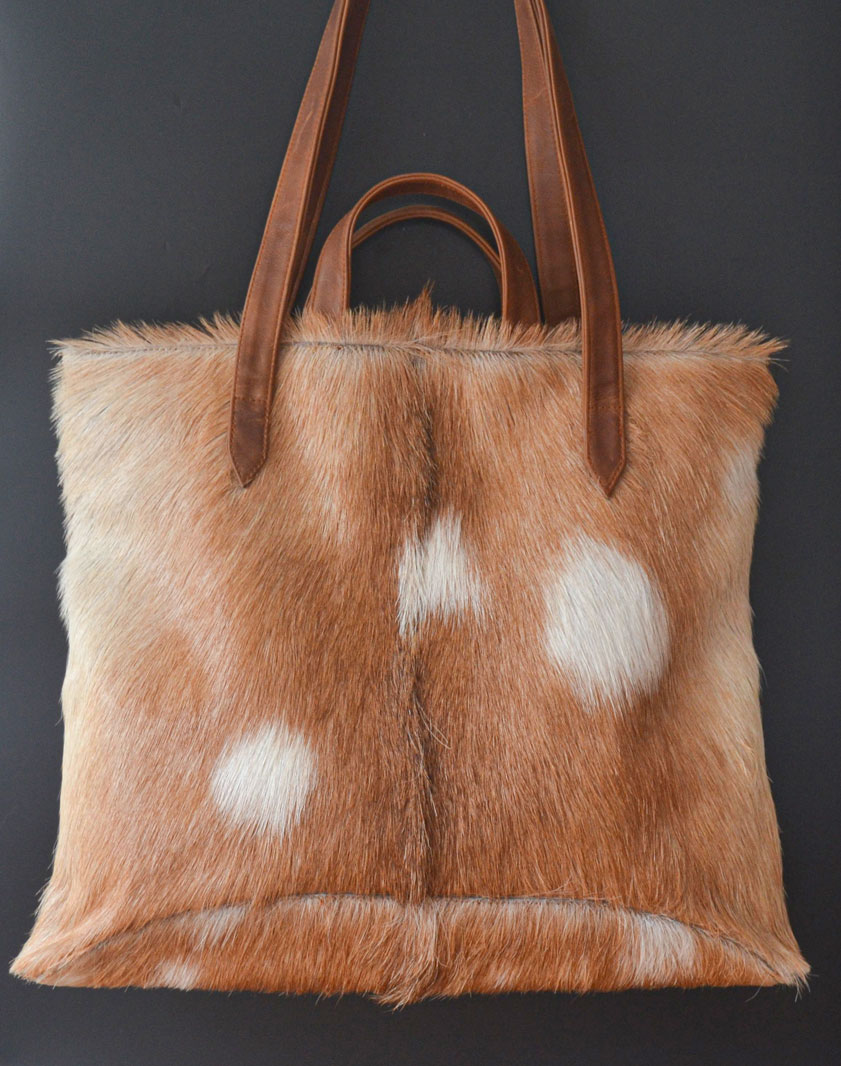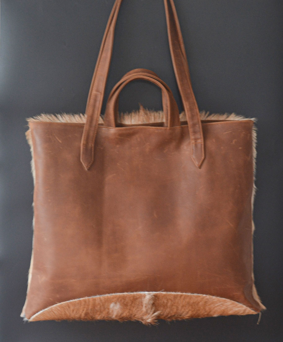 The big banger! King Billy Tote will serve you perfectly, from work files, to overnight bag, gym bag, baby bag, whilst making a statement with your one of a kind hide! With a goat hide front and a soft leather back. Featuring internal zip pocket with 2 additional easy access pockets for mobile phone, keys and accessories. You can carry by the handles or the shoulder straps. Each hide is handpicked and forever unique!