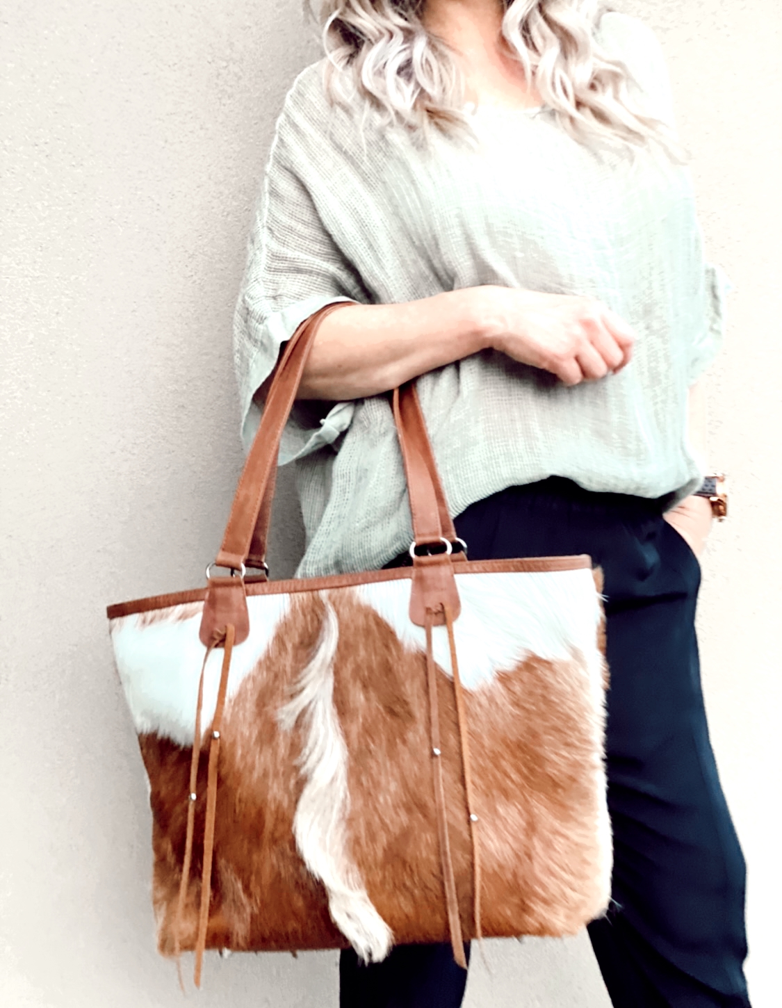 The Queen Billy Tote will serve you perfectly, from work files, baby bag to overnight bag and more, whilst making a statement with your one of a kind hide.  Front and back covered in hide with tassels cascading down from straps.  Featuring internal zip pocket and 2 additional easy access pockets for mobile phone, keys and accessories. Each hide is handpicked and forever unique!