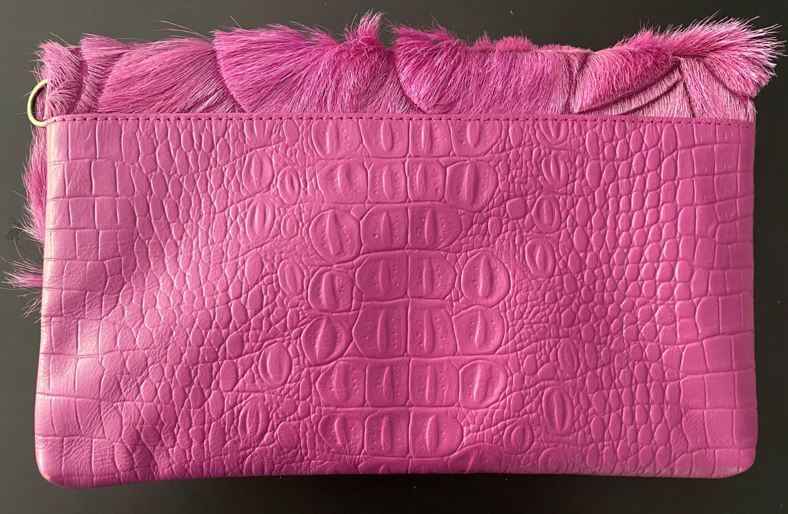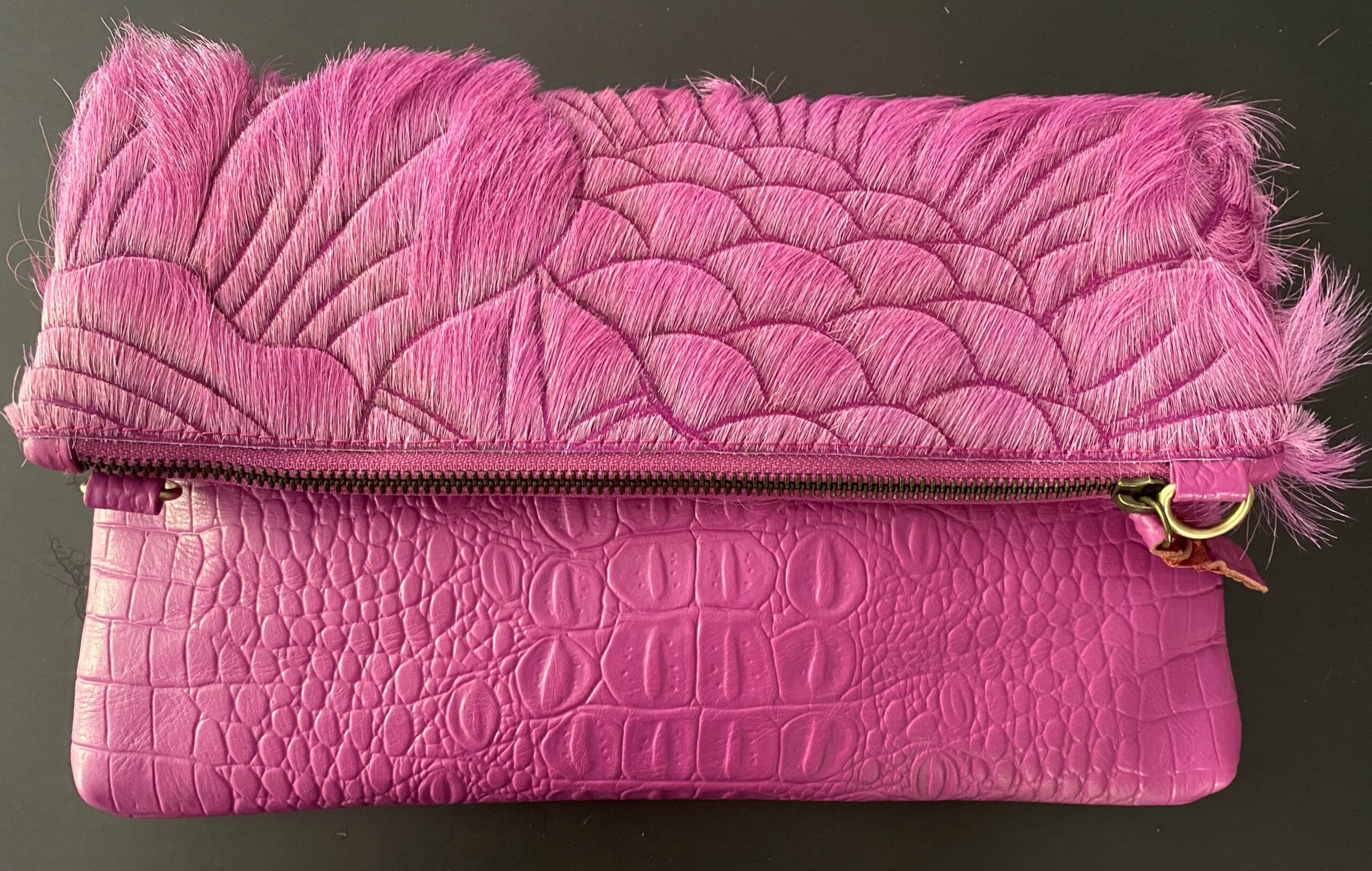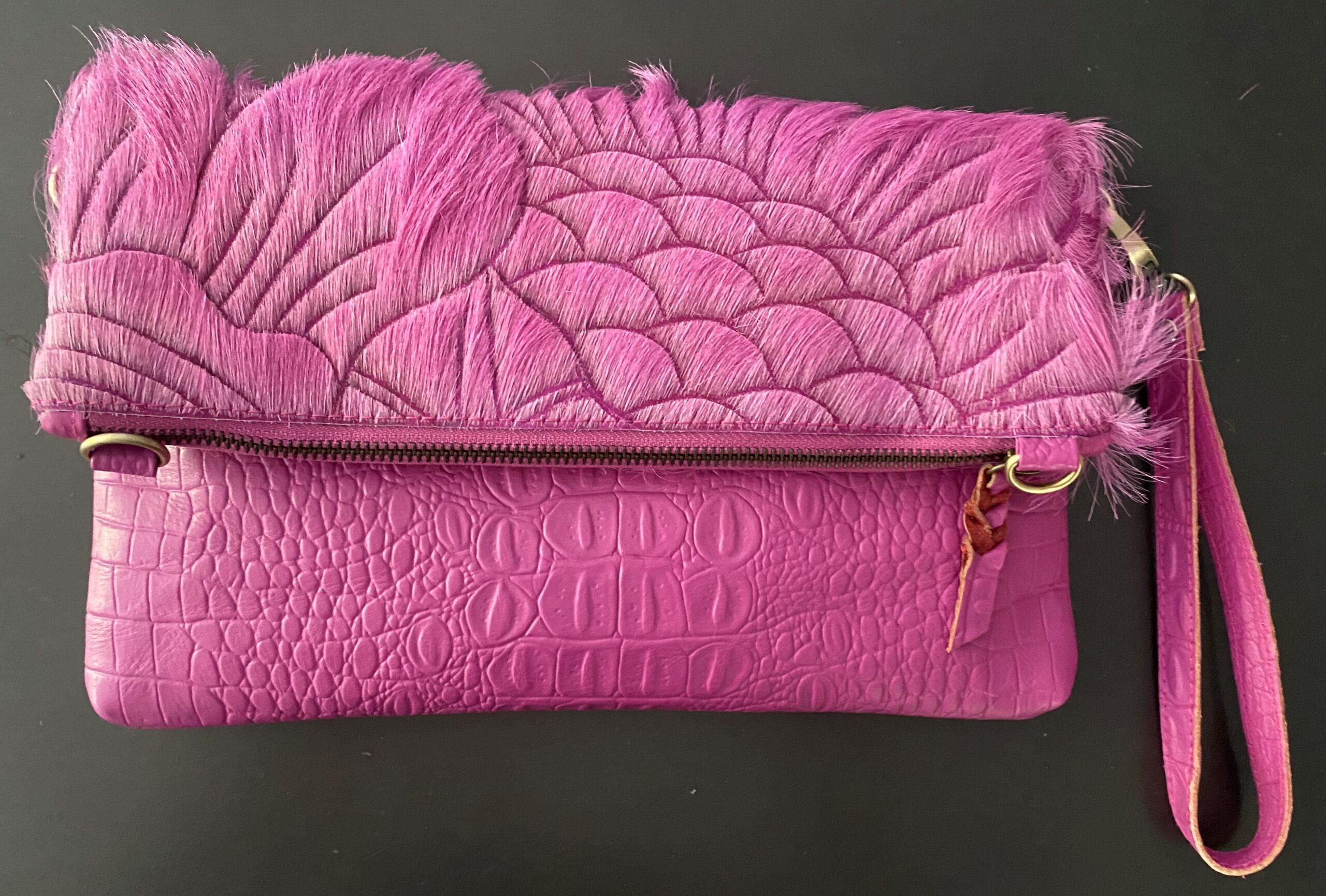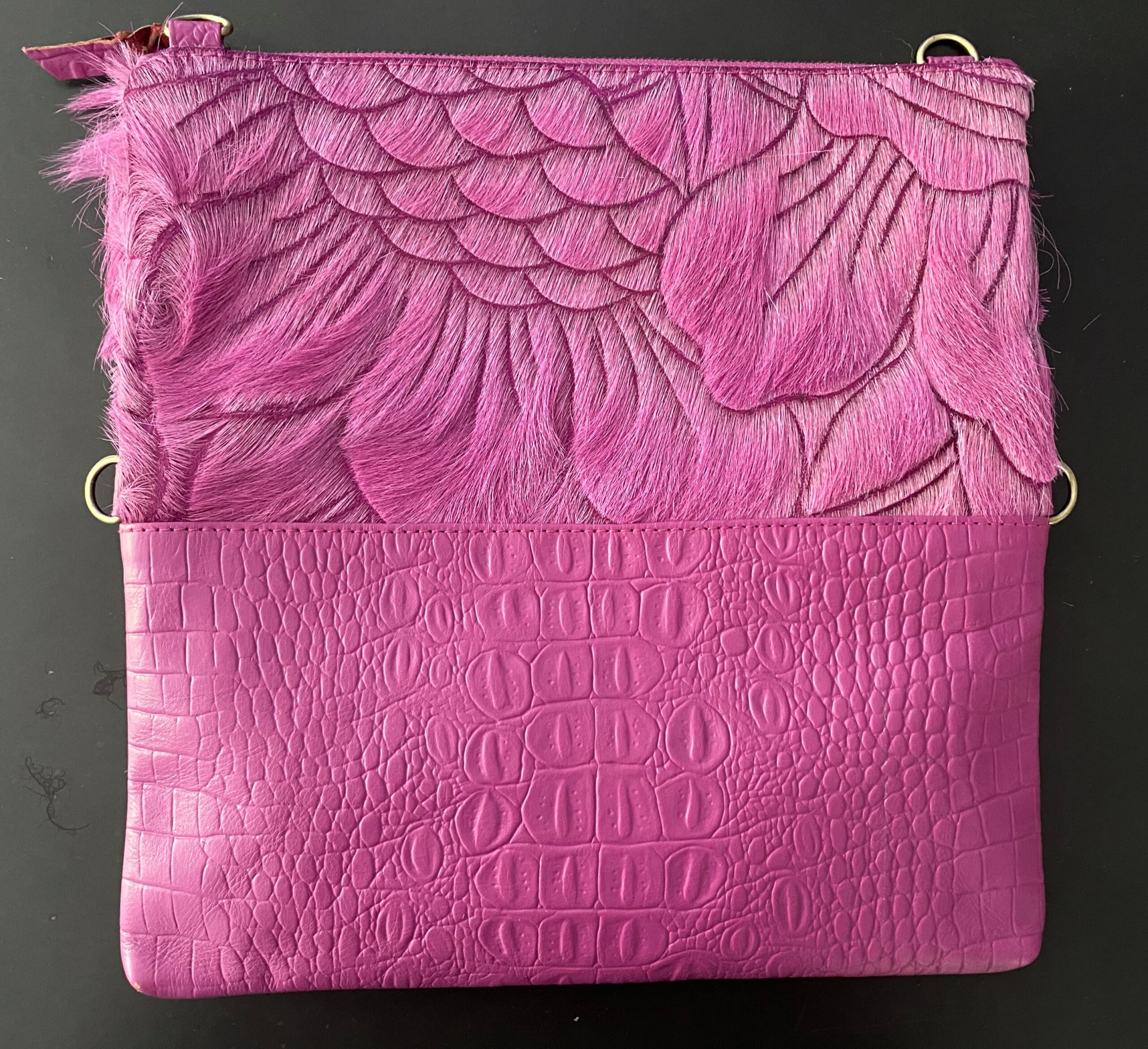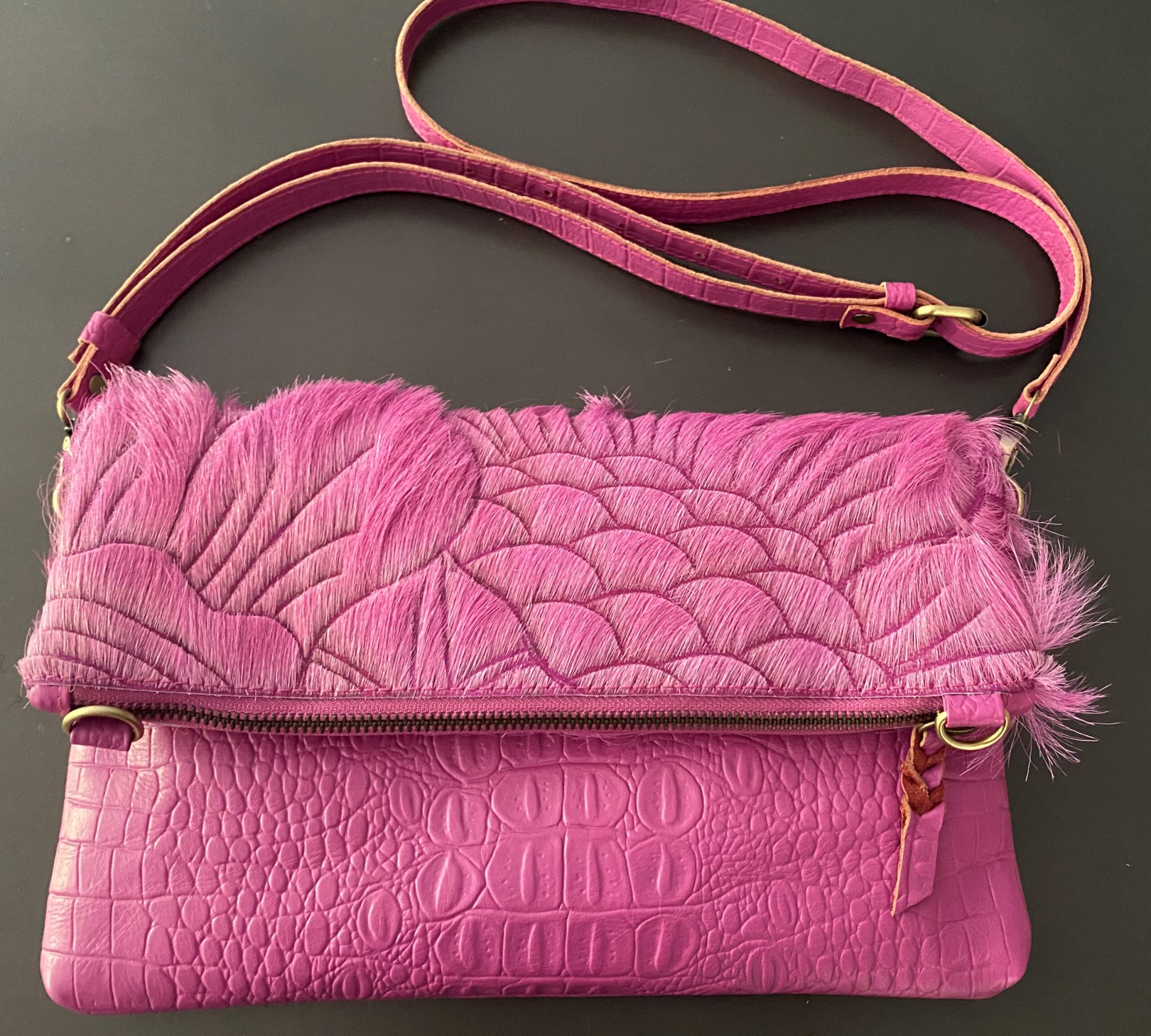 The Roxby is hand crafted from Goat hide and embossed croc, colour dyed, and hand carved by skilled artisans. There is enough space to carry your essentials, lippy, phone, wallet. She can be worn 3 ways: fully open as sling bag with detachable/adjustable shoulder strap to show full carved hide and embossed croc, cross body folded over or wear as a clutch with a detachable wristlet, with 4 strong invisible magnets holding her in place. Featuring suede lining, embossed croc detachable shoulder strap and wristlet, internal zip pocket with 1 additional easy access pocket. The perfect bag to take to lunch with the girls and into the night! This stunning piece is a must have to compliment any outfit.