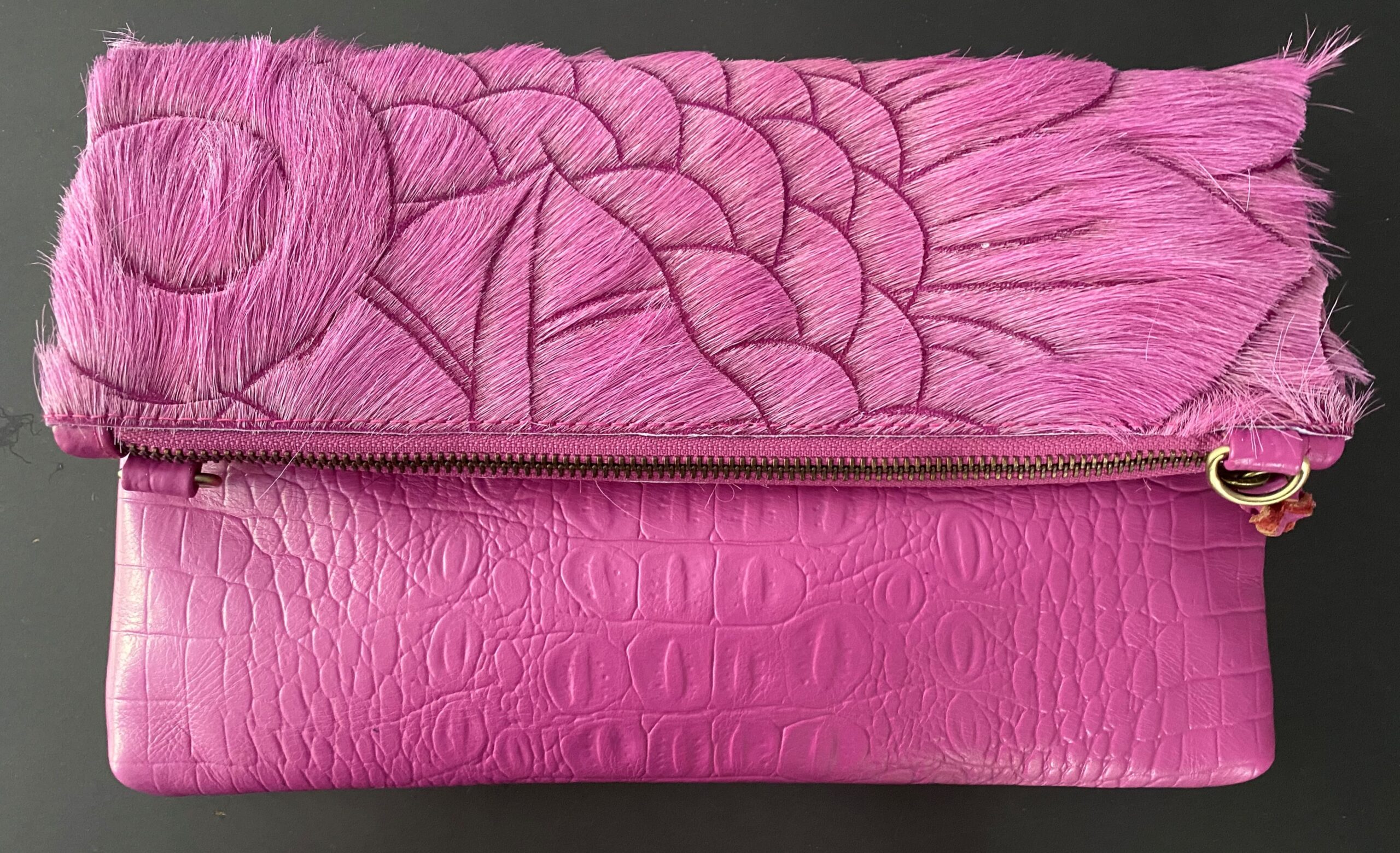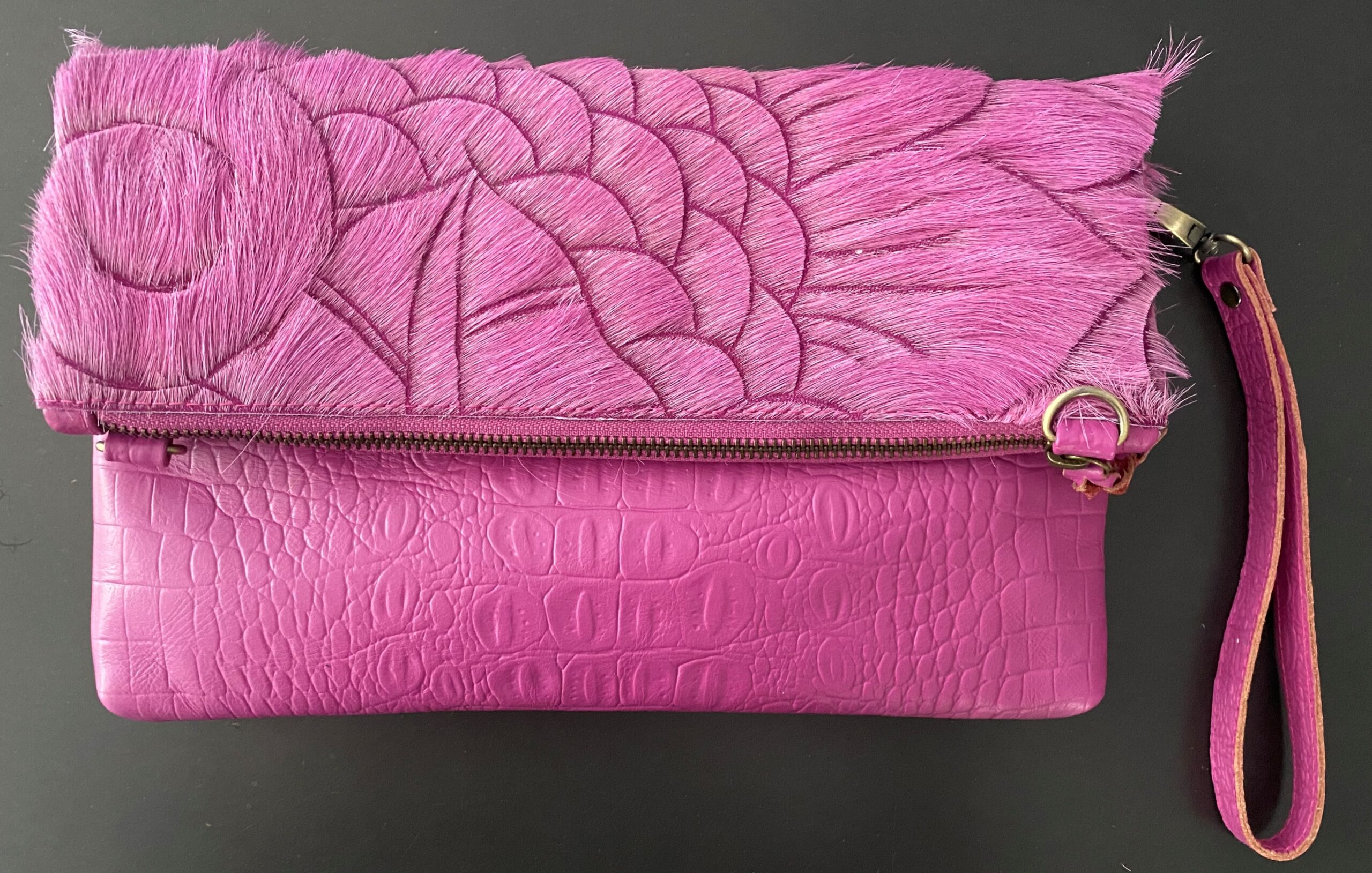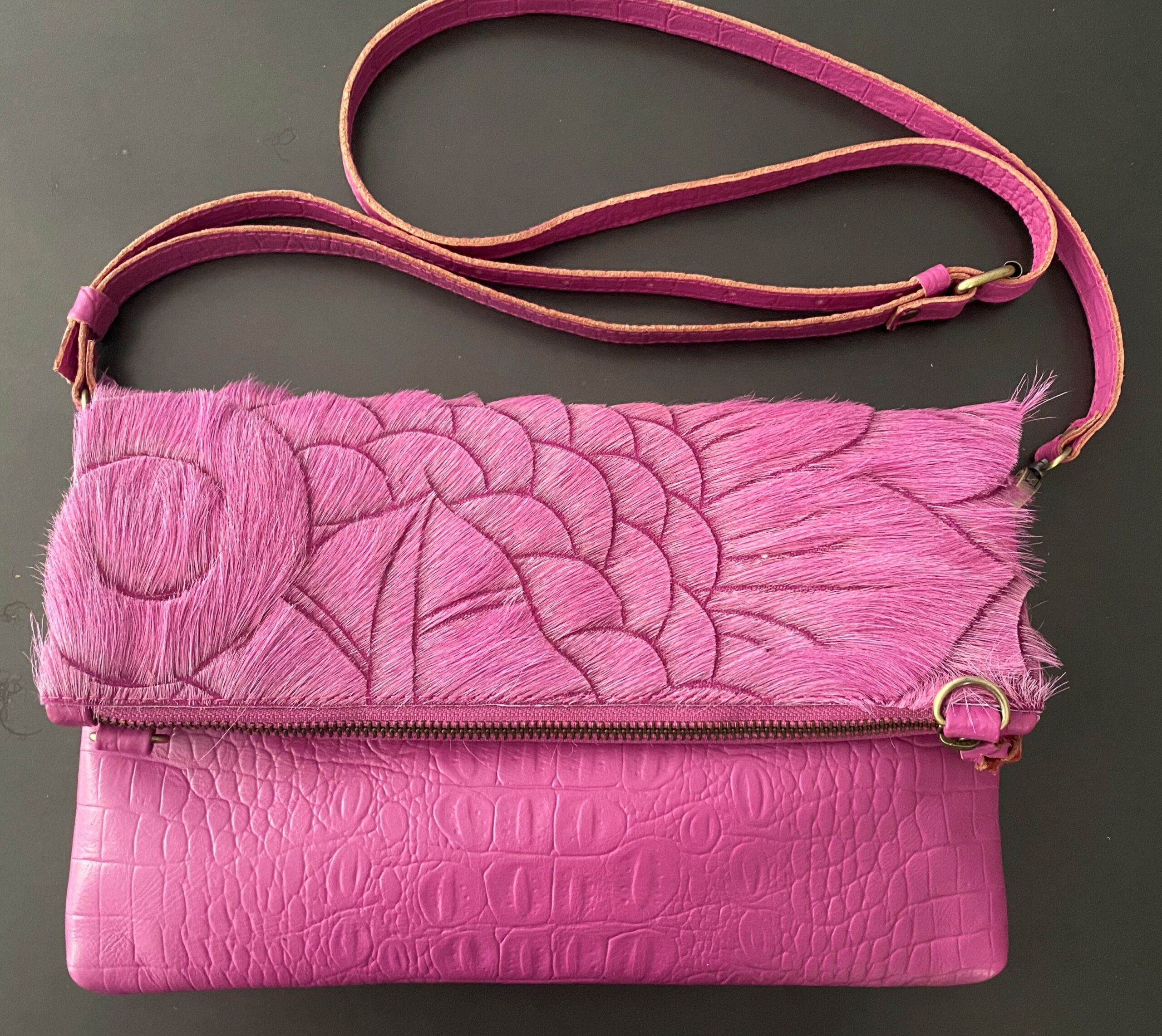 The Roxby is hand crafted from Goat hide and embossed croc, colour dyed, and hand carved by skilled artisans. There is enough space to carry your essentials, lippy, phone, wallet. She can be worn 3 ways: fully open as sling bag with detachable/adjustable shoulder strap to show full carved hide and embossed croc, cross body folded over or wear as a clutch with a detachable wristlet, with 4 strong invisible magnets holding her in place. Featuring suede lining, embossed croc detachable shoulder strap and wristlet, internal zip pocket with additional easy access slip pocket. The perfect bag to take to lunch with the girls and into the night! This stunning piece is a must have to compliment any outfit.