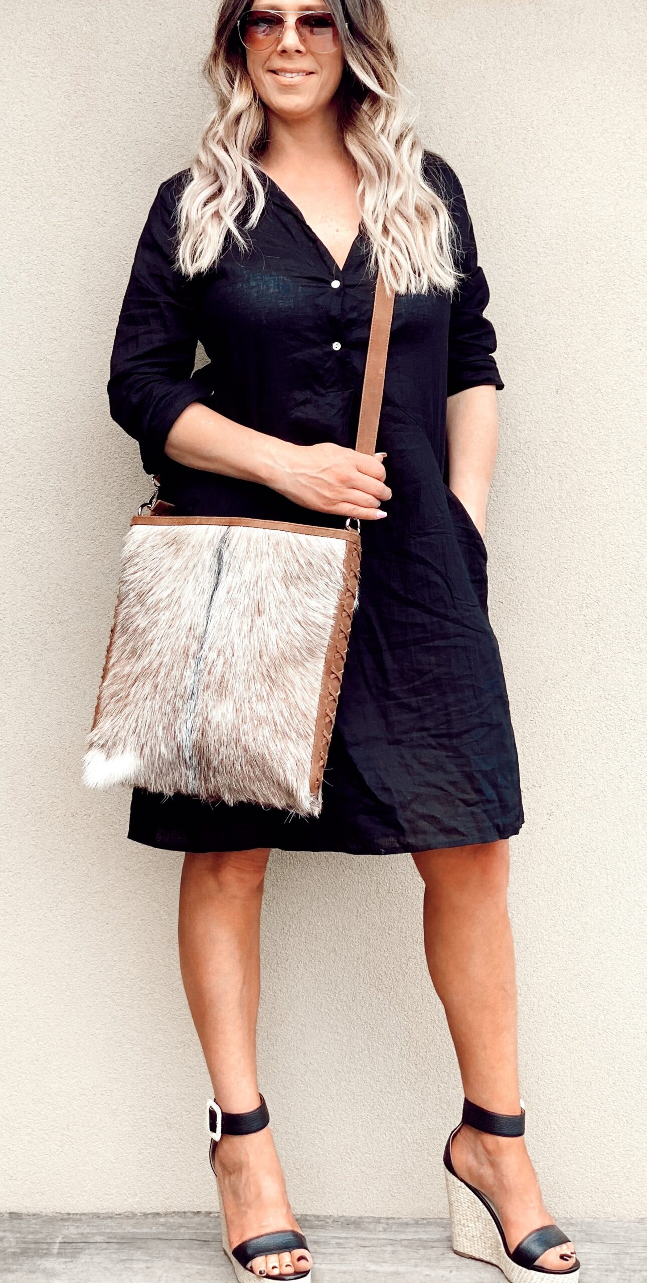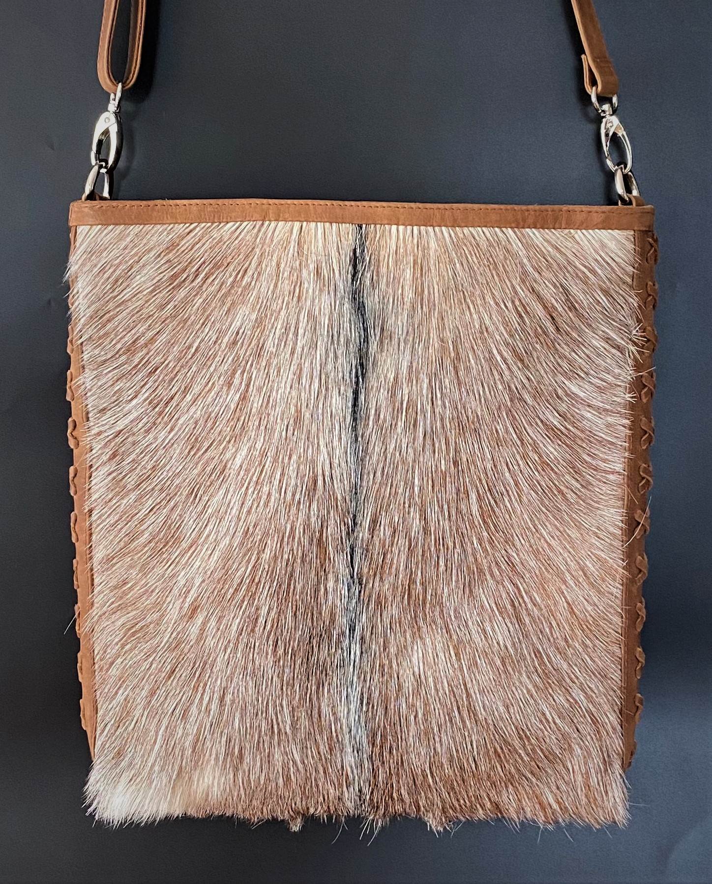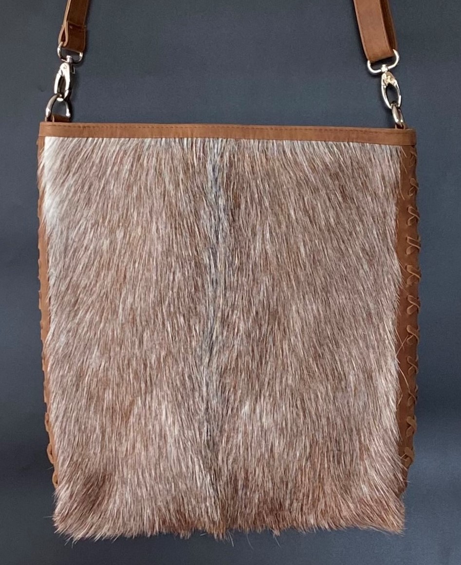 Introducing the Sorrento hide handbag, this stylish and uniquely designed bag is perfect for everyday use for carrying all your essentials needed throughout the day. The shoulder strap is adjustable/detachable to accommodate a cross body wear. Hide on both sides of bag with great Criss Cross leather weave detail down both sides of the bag together with a long leather tassel.  Featuring internal zip pocket with 2 additional easy access pockets for mobile phone, keys and accessories.  Each piece is handpicked and one of a kind, forever unique!