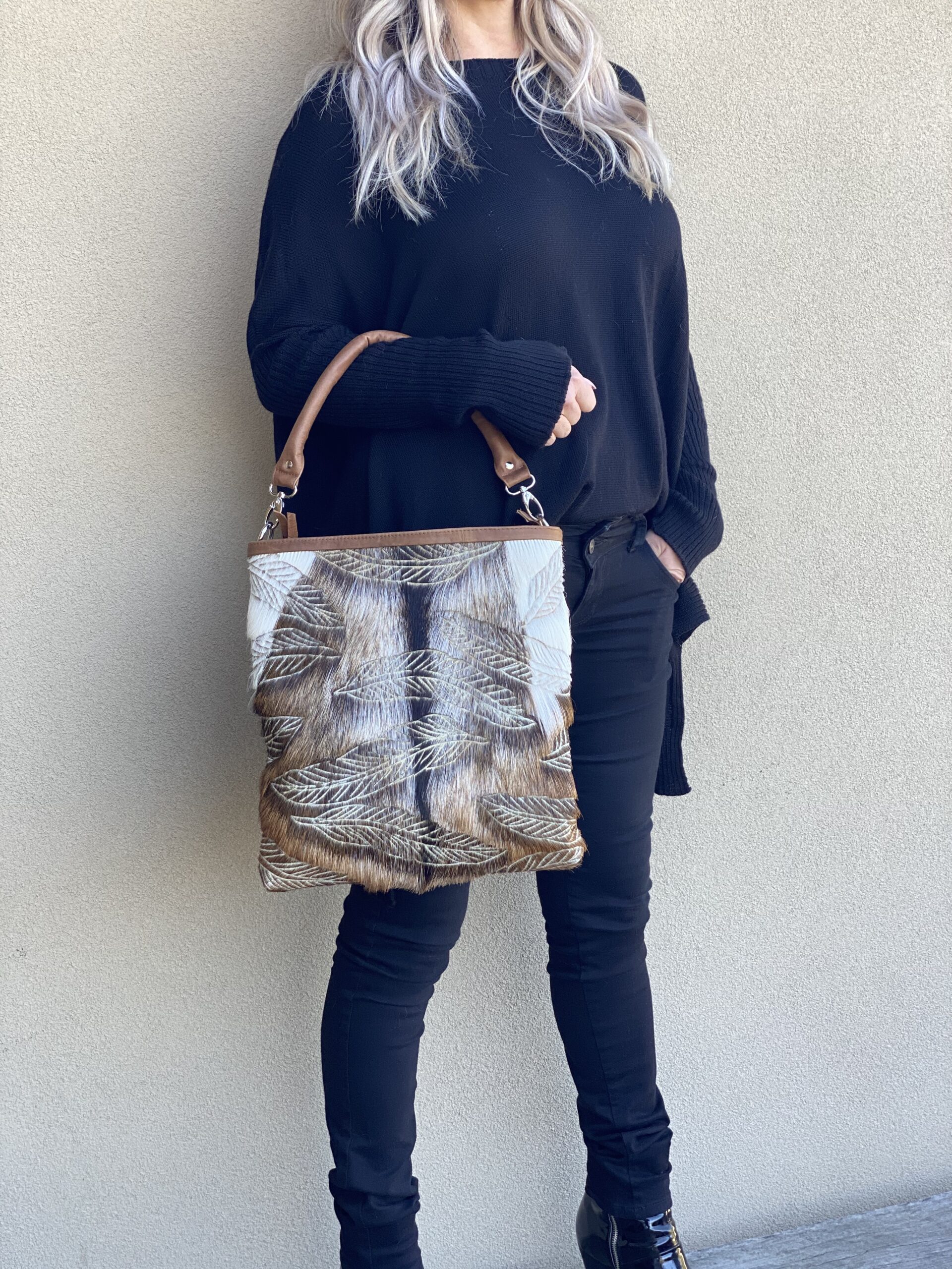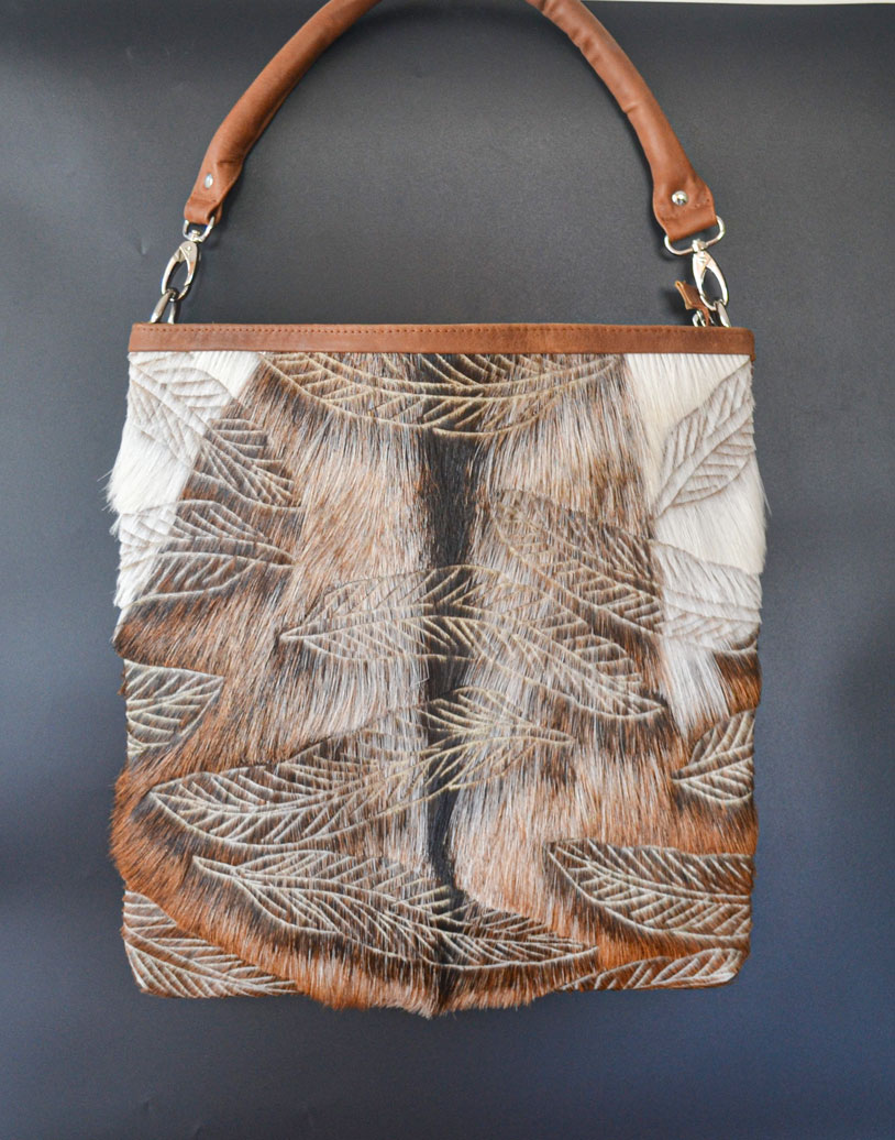 This Uluru bag is a statement piece which is hand carved with Tribal feathers on the front and a soft Nubuck leather on the back, perfect for everyday use, can be carried Audrey Hepburn style, off the arm with classic lines or on the shoulder with detachable strap for days on the run! This bag features a top zipper closure, internal zip pocket with 2 additional easy access pockets for mobile phone, keys and accessories. Each hide is handpicked and one of a kind, forever unique!